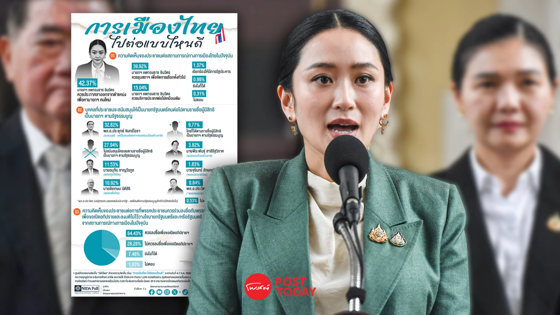 เมื่อวันที่ 13 กรกฎาคม 2568 ศูนย์สำรวจความคิดเห็น “นิด้าโพล” สถาบันบัณฑิตพัฒนบริหารศาสตร์ เปิดเผยผลสำรวจเรื่อง “การเมืองไทย ไปต่อแบบไหนดี” ที่จัดทำระหว่างวันที่ 4-7 กรกฎาคม 2568 โดยเก็บข้อมูลจากกลุ่มตัวอย่างจำนวน 1,310 รายทั่วประเทศ พบว่า ร้อยละ 42.37 เห็นว่านายกรัฐมนตรี แพทองธาร ชินวัตร ควร ลาออกจากตำแหน่ง และ ร้อยละ 39.92 เห็นควร ยุบสภาเพื่อเลือกตั้งใหม่ รวมแล้วเกิน ร้อยละ 80 ที่ต้องการให้เกิดการเปลี่ยนแปลงทางการเมือง