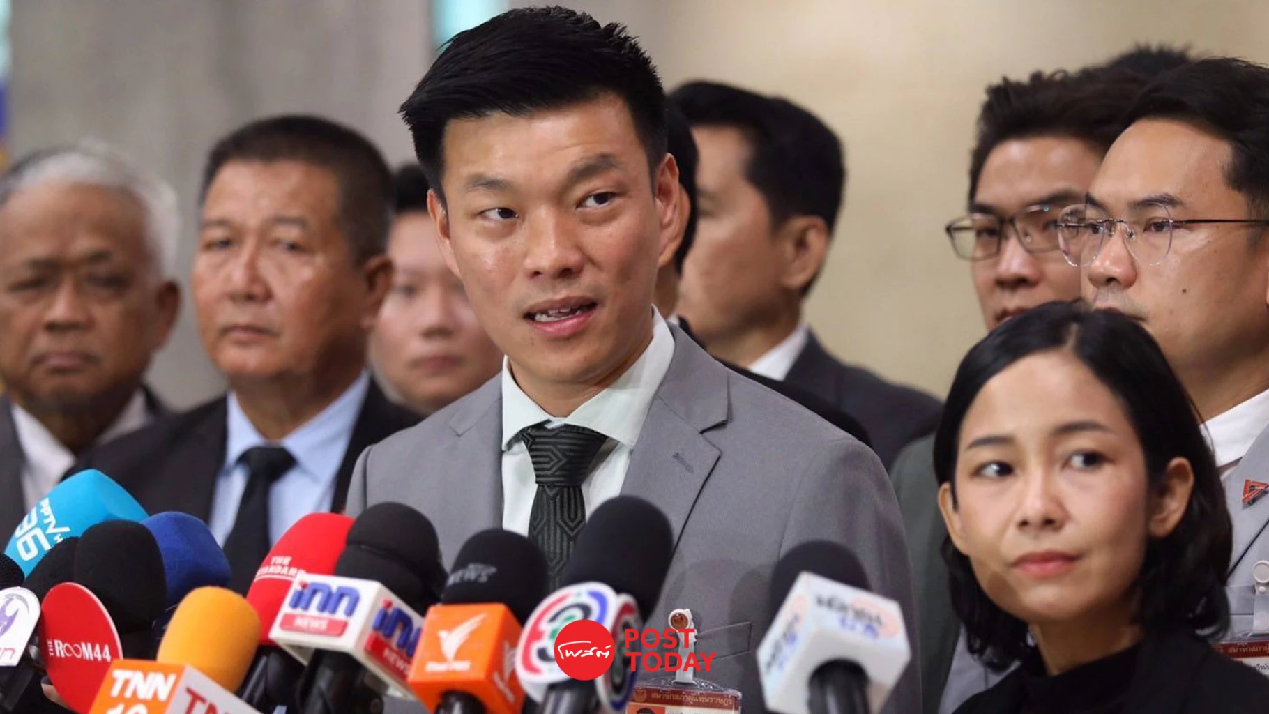 นายณัฐพงษ์ เรืองปัญญาวุฒิ หัวหน้าพรรคประชาชน แถลงข่าวร่วมกับ สส.พรรคประชาชน หลังจากสภาผู้แทนราษฎรลงมติผ่านร่างกฎหมายนิรโทษกรรม 3 ร่าง ขณะที่ไม่รับหลักการร่างของอดีตพรรคก้าวไกลและร่างของภาคประชาชน