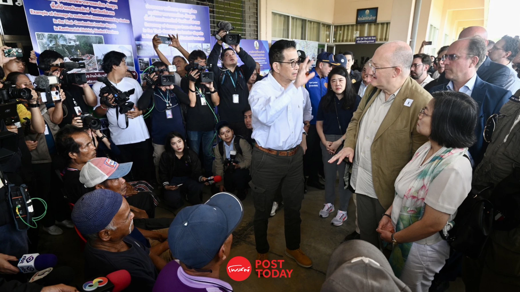 ทั้งนี้ ในการลงพื้นที่ช่วงเช้า คณะทูตานุทูต ได้ลงพื้นที่ที่โรงเรียนภูมิซรอลวิทยา ตำบลเสาธงชัย อำเภอกันทรลักษ์ จังหวัดศรีสะเกษ เพื่อรับฟังการบรรยายสรุปจากกองทัพบก กระทรวงการต่างประเทศ และกระทรวงมหาดไทยก่อน พร้อม รับชมวีดิทัศน์ชุด “เสียงระเบิด...ที่โลกไม่ได้ยิน แต่ชาวศรีสะเกษไม่มีวันลืม” ที่เล่าเรื่องราว ตั้งแต่วันเริ่มต้นของความสูญเสีย ในวันที่ 24 กรกฎาคม 2568 หลังเกิดเสียงระเบิดที่ดังขึ้นในยามเช้า ไร้การเตือนล่วงหน้า และเป็นจุดเริ่มต้นของสถานการณ์ความไม่สงบชายแดนไทย–กัมพูชา และนำมาซึ่งความทุกข์ระทมมา ของพี่น้องประชาชนชาวศรีสะเกษกว่า 260,000 ครัวเรือน รวมกว่า 780,000 คน