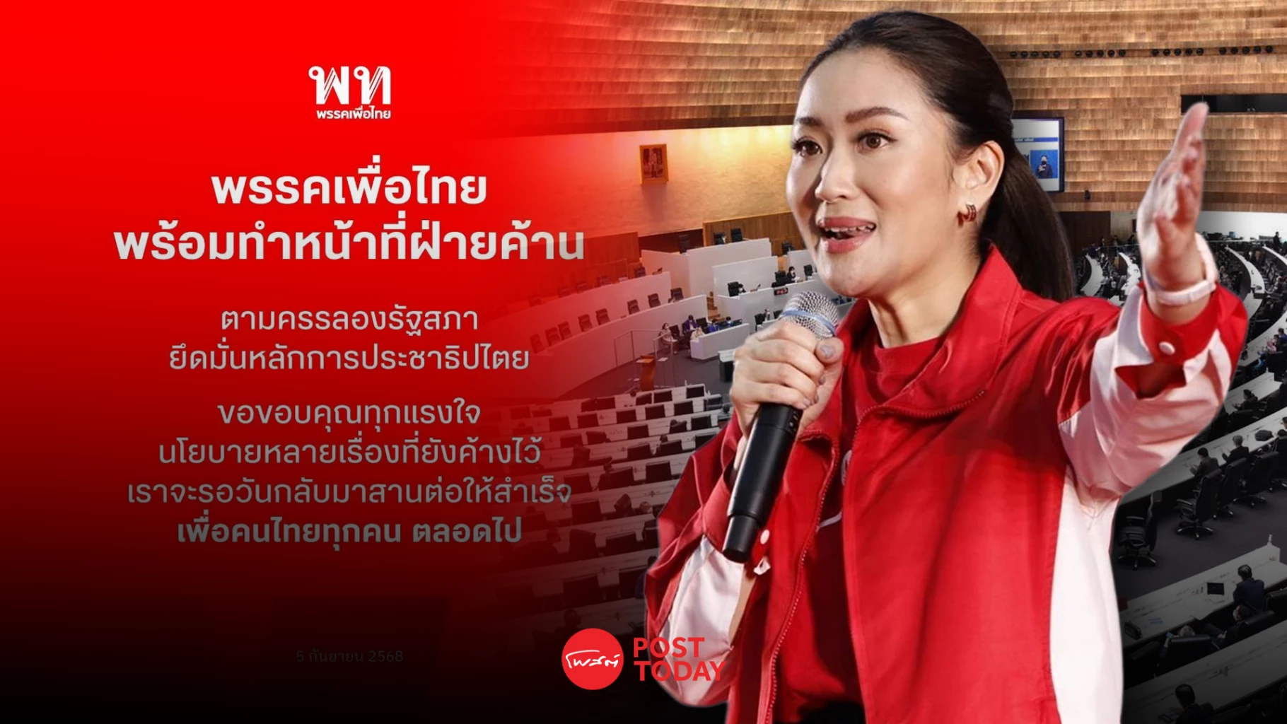 เมื่อวันที่ 5 กันยายน 2568 นางสาวแพทองธาร ชินวัตร อดีตนายกรัฐมนตรี และหัวหน้าพรรคเพื่อไทย โพสต์ข้อความผ่านแพลตฟอร์ม x.com และเฟซบุ๊ก ยืนยันจุดยืนว่า พรรคเพื่อไทยจะทำหน้าที่ฝ่ายค้านอย่างเข้มแข็ง ตรวจสอบการทำงานของรัฐบาลชุดใหม่ภายใต้การนำของนายอนุทิน ชาญวีรกูล