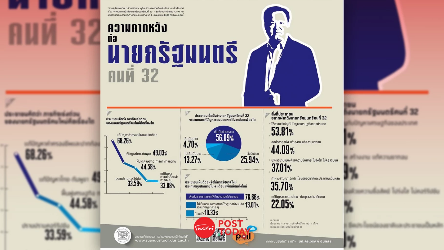 สวนดุสิตโพล มหาวิทยาลัยสวนดุสิต สำรวจความคิดเห็นประชาชนทั่วประเทศ เรื่อง “ความคาดหวังต่อนายกรัฐมนตรีคนที่ 32” กลุ่มตัวอย่างจำนวน 1,191 คน พบว่า ภารกิจเร่งด่วนที่อยากให้นายกรัฐมนตรีคนใหม่ดำเนินการมากที่สุด คือ การแก้ปัญหาค่าครองชีพและปากท้อง ร้อยละ 68.26, รองลงมาร้อยละ 49.03 แก้ไขปัญหาไทย-กัมพูชา, ส่วนร้อยละ 44.58 ฟื้นฟูเศรษฐกิจ การค้าการลงทุน, ร้อยละ 33.59 ปราบปรามคอร์รัปชัน และ 33.08 แก้ปัญหาความเหลื่อมล้ำทางสังคม