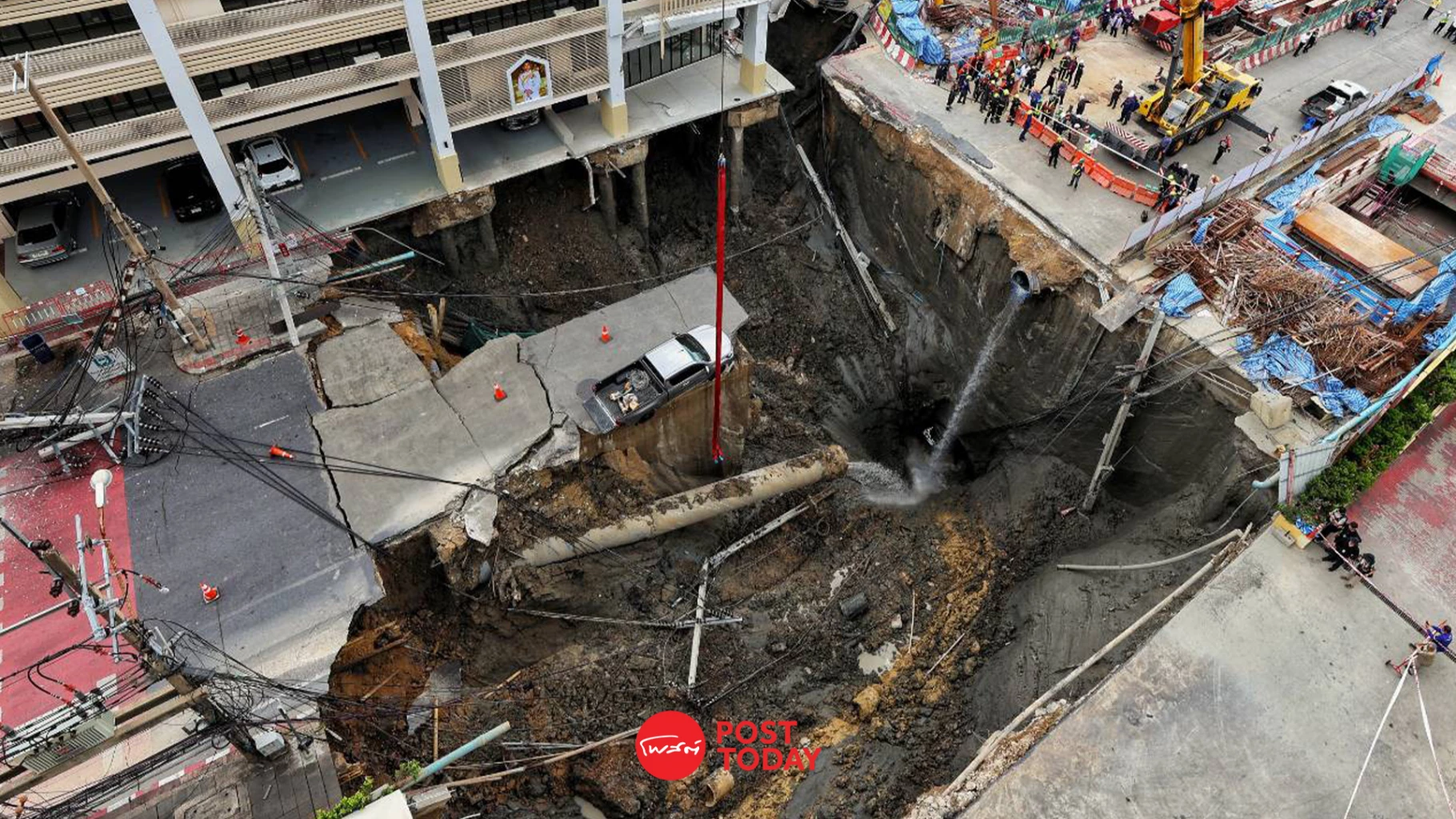 - ปัจจัยกระตุ้นเกิดจากท่อประปาแตก ฝนตกหนักที่ชะล้างดินจนเกิดโพรงใต้ดิน และอาจมีผลกระทบจากการก่อสร้างรถไฟฟ้าใต้ดินในพื้นที่