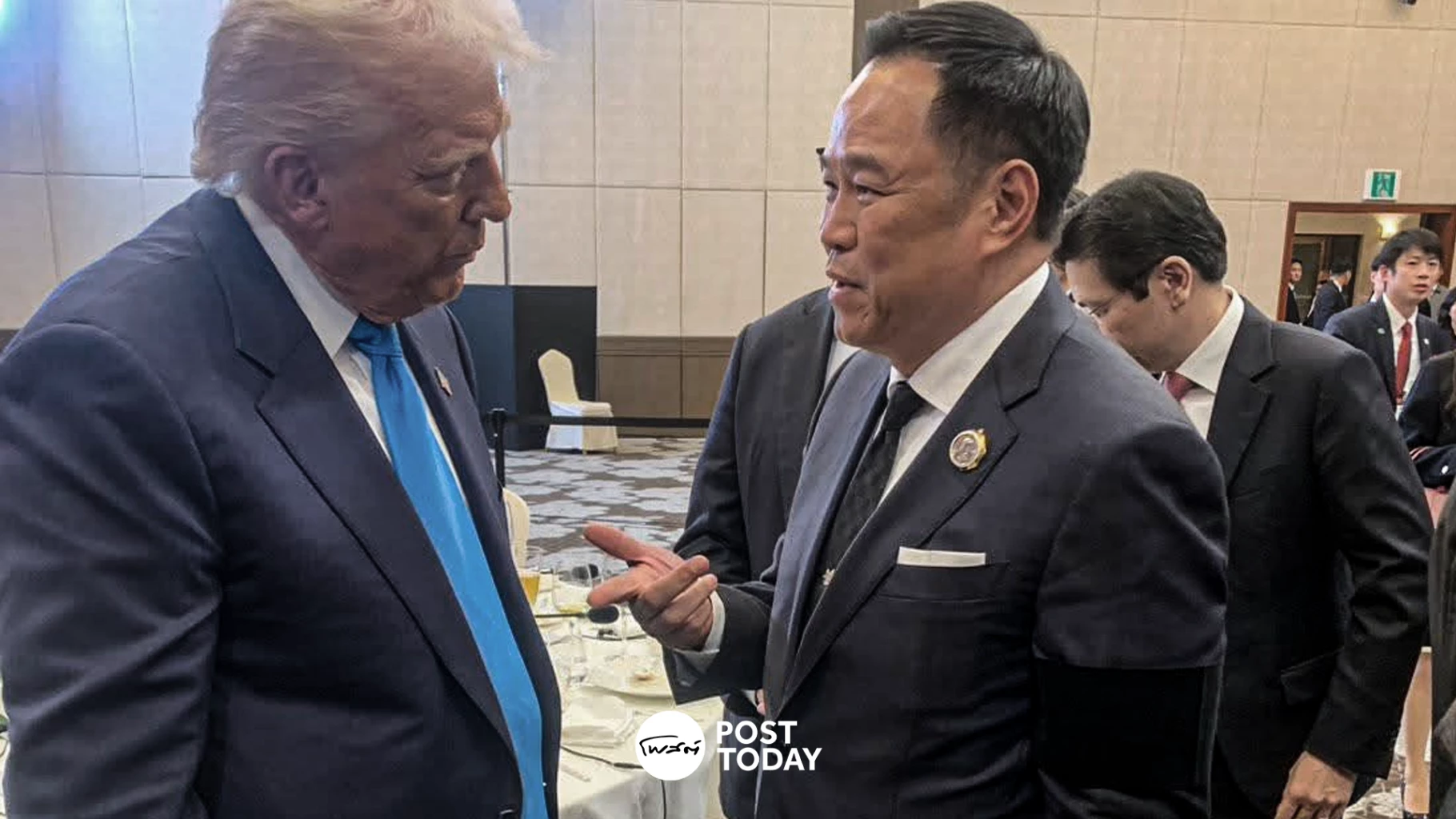 นายอนุทิน ชาญวีรกูล นายกรัฐมนตรีและรัฐมนตรีว่าการกระทรวงมหาดไทย ได้พูดคุยเป็นการส่วนตัวกับนายโดนัลด์ ทรัมป์ ประธานาธิบดีสหรัฐอเมริกา ภายหลังเสร็จสิ้นงานเลี้ยงอาหารค่ำแก่ผู้นำเขตเศรษฐกิจเอเปกเป็นกรณีพิเศษ ที่นายอี แช-มย็อง ประธานาธิบดีเกาหลีใต้เป็นเจ้าภาพ โดยมีการพูดคุยขอให้ทรัมป์ได้ช่วยดูแลเรื่องภาษีของไทยให้ได้อัตราที่ดีขึ้น ซึ่งมีแนวโน้มว่าในการเจรจาจะเป็นไปในทิศทางที่ดี
