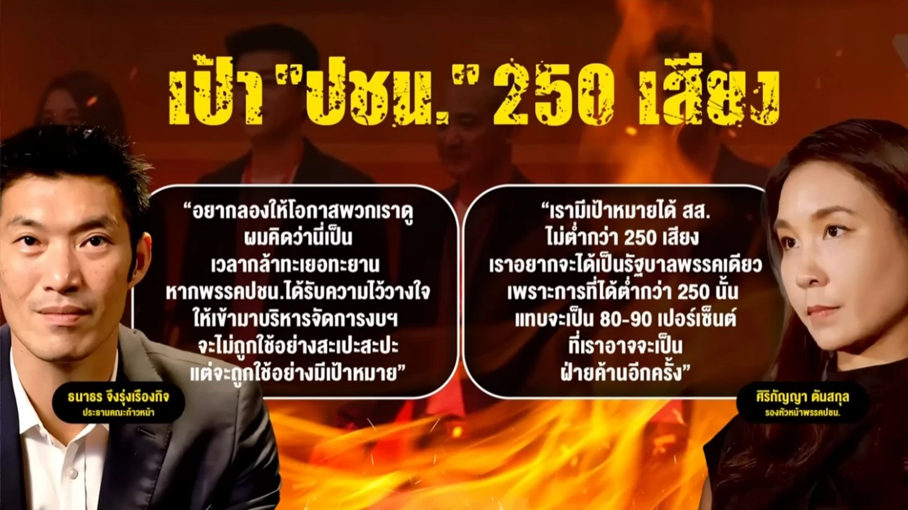 พรรคประชาชนในฐานะแชมป์เก่า ตั้งเป้าหมายชัดเจนว่าต้องการจัดตั้ง “รัฐบาลพรรคเดียว” ด้วยจำนวน ส.ส. ไม่ต่ำกว่า 250 ที่นั่ง โดยใช้จุดแข็งเดิมคือคะแนนนิยมระดับชาติที่เคยผลักดันอดีตพรรคก้าวไกลคว้า 151 ที่นั่ง เมื่อรวมกับการประกาศรายชื่อแคนดิเดตนายกฯ ทั้ง 3 คน ได้แก่ ณัฐพงษ์ เรืองปัญญาวุฒิ,ศิริกัญญา ตันสกุลและวีระยุทธ กาญจน์ชูฉัตร ยิ่งตอกย้ำแนวทางที่ต้องการความชัดเจนด้านอุดมการณ์ ความต่อเนื่องของนโยบาย และการชูแบรนด์พรรคเป็นเครื่องนำชัย