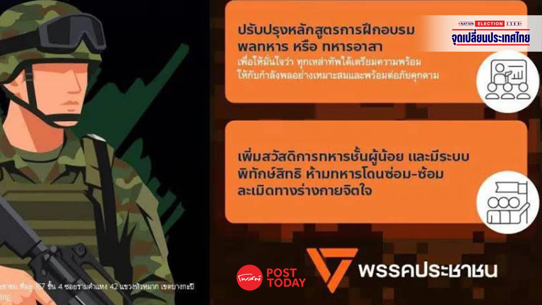 "พรรคประชาชน" ชูข้อเสนอ ยกเลิกบังคับเกณฑ์ทหาร ลดอัตราทหารส่วนธุรการลง คงส่วนงานกำลังรบ เปิดรับทหารอาสาอย่างน้อย 30,000 อัตราต่อปี