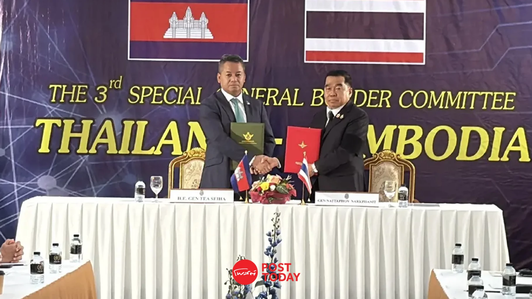 เมื่อเวลา 10.00 น. วันที่ 27 ธ.ค. 2568 พล.อ.ณัฐพล นาคพาณิชย์ รมว.กลาโหม เดินทางถึงที่ด่านถาวรบ้านผักกาด อ.โป่งน้ำร้อน จ.จันทบุรี และได้เข้าร่วมประชุมคณะกรรมการชายแดนทั่วไป GBC ไทย-กัมพูชา โดยฝ่ายกัมพูชา มี พล.อ.เตีย เซ็ยฮา รมว.กลาโหม มาร่วมประชุม พร้อมด้วยฝ่ายเลขานุการฯ GBC ฝ่ายไทยพล.อ.ณัฐพงษ์ เพราแก้ว รองเสนาธิการทหาร และ ฝ่ายกัมพูชาพล.ต.แยม โบราเดน รองหัวหน้าสำนักงานรมว.กลาโหมกัมพูชา ร่วมประชุมด้วย โดยมีการประชุมร่วมกันประมาณเวลา 30 นาที