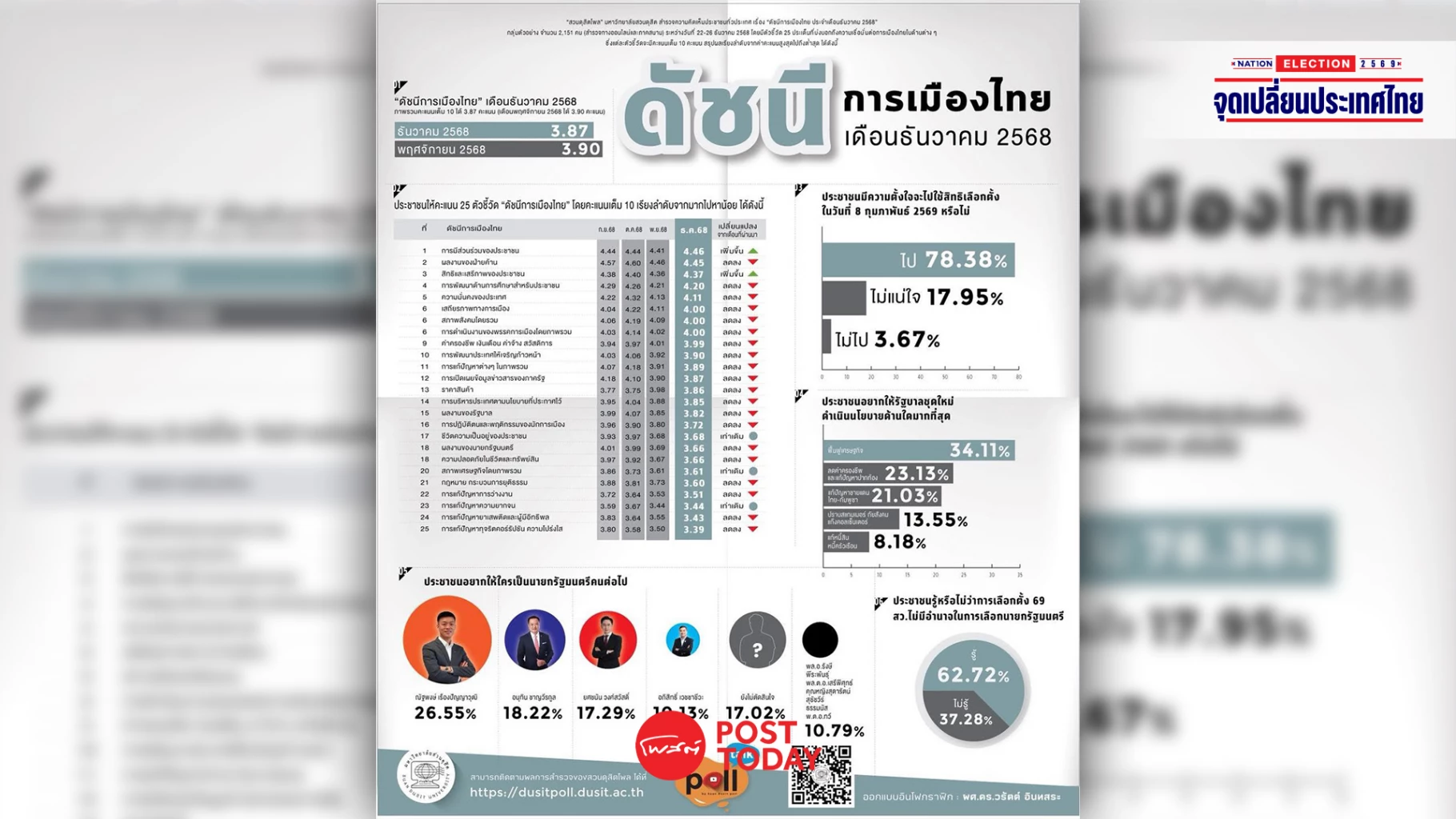 สวนดุสิตโพล มหาวิทยาลัยสวนดุสิต สำรวจความคิดเห็นประชาชนทั่วประเทศ เรื่อง “ดัชนีการเมืองไทย ประจำเดือนธันวาคม 2568” กลุ่มตัวอย่าง จำนวน 2,151 คน (สำรวจทางออนไลน์และภาคสนาม) ระหว่างวันที่ 22-26 ธันวาคม 2568 พบว่า กลุ่มตัวอย่างให้คะแนนภาพรวมดัชนีการเมืองไทยประจำเดือนธันวาคม 2568 เฉลี่ย 3.87 คะแนน ลดลงจากเดือนพฤศจิกายน 2568 ที่ได้ 3.90 คะแนน ตัวชี้วัดที่ได้คะแนนสูงสุด คือ การมีส่วนร่วมของประชาชน เฉลี่ย 4.46 คะแนน ตัวชี้วัดที่ได้คะแนนต่ำสุด คือ