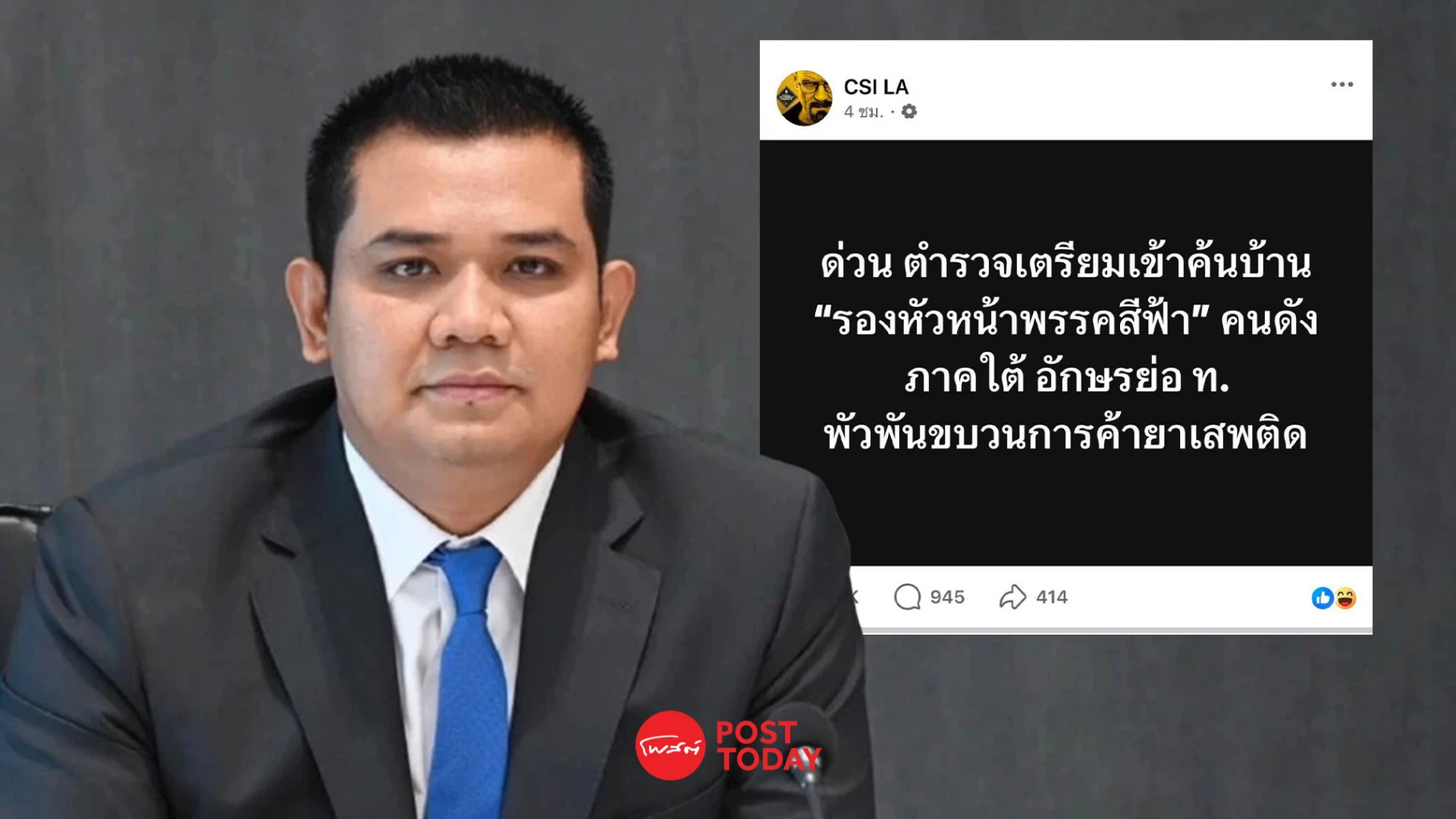 กระแสวิพากษ์วิจารณ์ในโลกออนไลน์ร้อนแรง หลังเพจดัง CSI LA โพสต์ข้อความระบุว่า ตำรวจเตรียมเข้าค้นบ้าน “รองหัวหน้าพรรคสีฟ้า” คนดังในภาคใต้ อักษรย่อ ท. โดยอ้างว่าพัวพันขบวนการค้ายาเสพติด