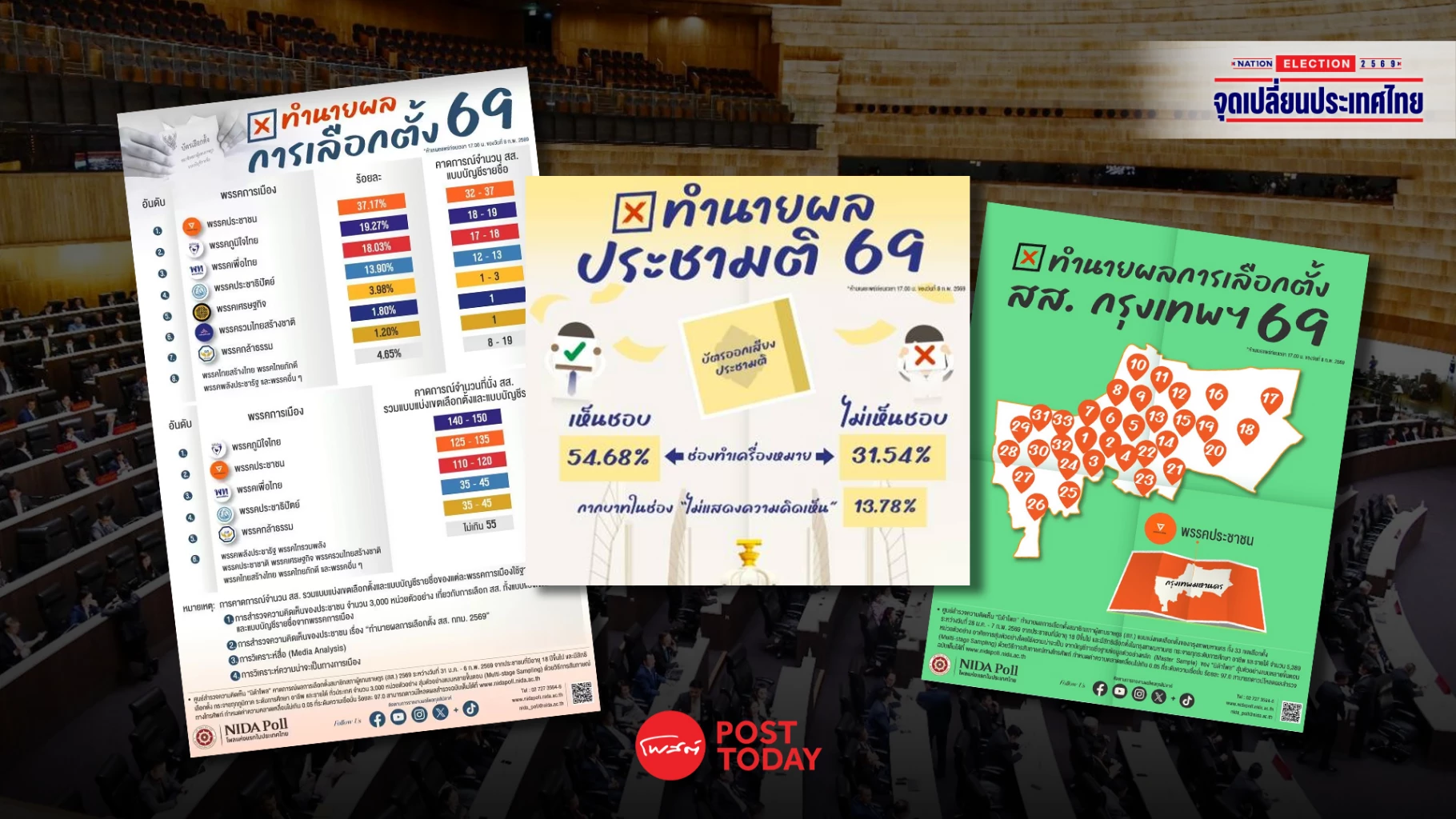 ศูนย์สำรวจความคิดเห็น “นิด้าโพล” สถาบันบัณฑิตพัฒนบริหารศาสตร์ (นิด้า) เปิดเผยผลทำนายการเลือกตั้งสมาชิกสภาผู้แทนราษฎร ( สส.) เป็นการทั่วไป พ.ศ. 2569 จากการสำรวจกลุ่มตัวอย่าง 3,000 หน่วยตัวอย่างทั่วประเทศ พบการเปลี่ยนแปลงทางเมืองครั้งสำคัญ