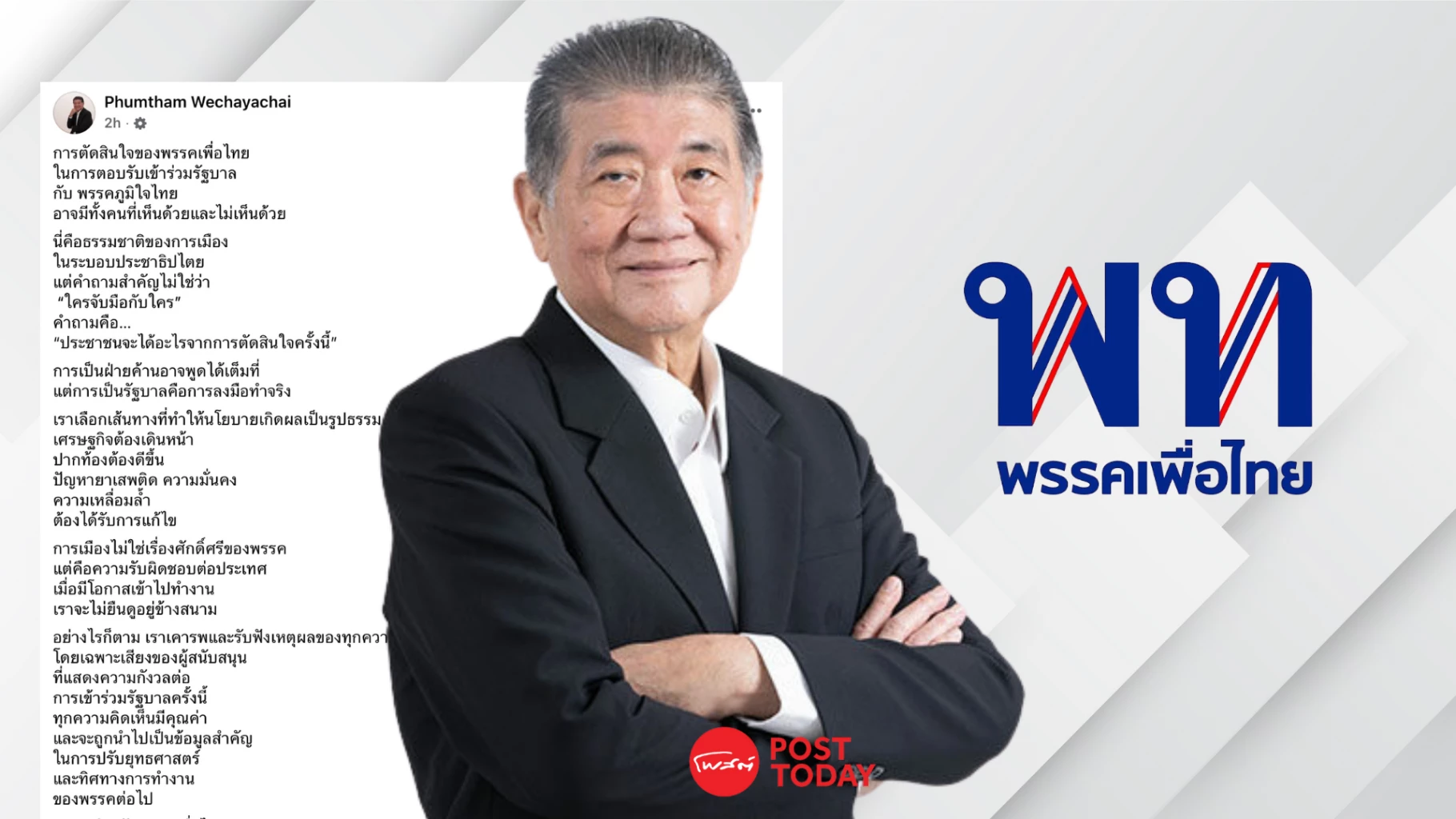 นายภูมิธรรม เวชยชัย แกนนำพรรคเพื่อไทย สื่อสารผ่านเฟซบุ๊กส่วนตัวถึงทิศทางการเมืองของพรรค โดยระบุว่าการตัดสินใจตอบรับเข้าร่วมรัฐบาลกับพรรคภูมิใจไทยนั้น เป็นเรื่องปกติในระบอบประชาธิปไตยที่จะมีทั้งผู้ที่เห็นด้วยและไม่เห็นด้วย
