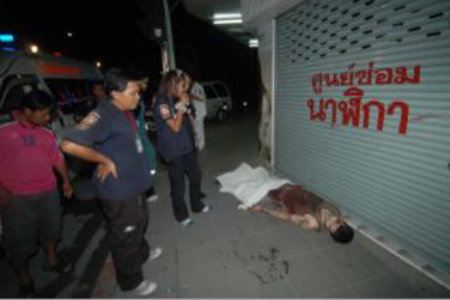 ที่เกิดเหตุเป็นหน้าร้านจำหน่ายนาฬิกา และแว่นตา พบศพนายไคล โนแอล อายุ 31 ปี (clive noel) สัญชาติไอซ์แลนด์ สภาพศพสวมเสื้อกล้ามสีน้ำตาล กางเกงขาสั้นลายสก๊อตขาวลายน้ำตาล เปื้อนเลือด นอนหงายมีบาดแผลบริเวณข้อมือทั้ง 2 ข้าง บริเวณฟุตบาธห่างไปประมาณ 100 เมตร ของถนนพบรอยเลือดหยดเป็นทางและมีร่องรอยการล้มลุกคลุกคลานเป็นช่วงๆ