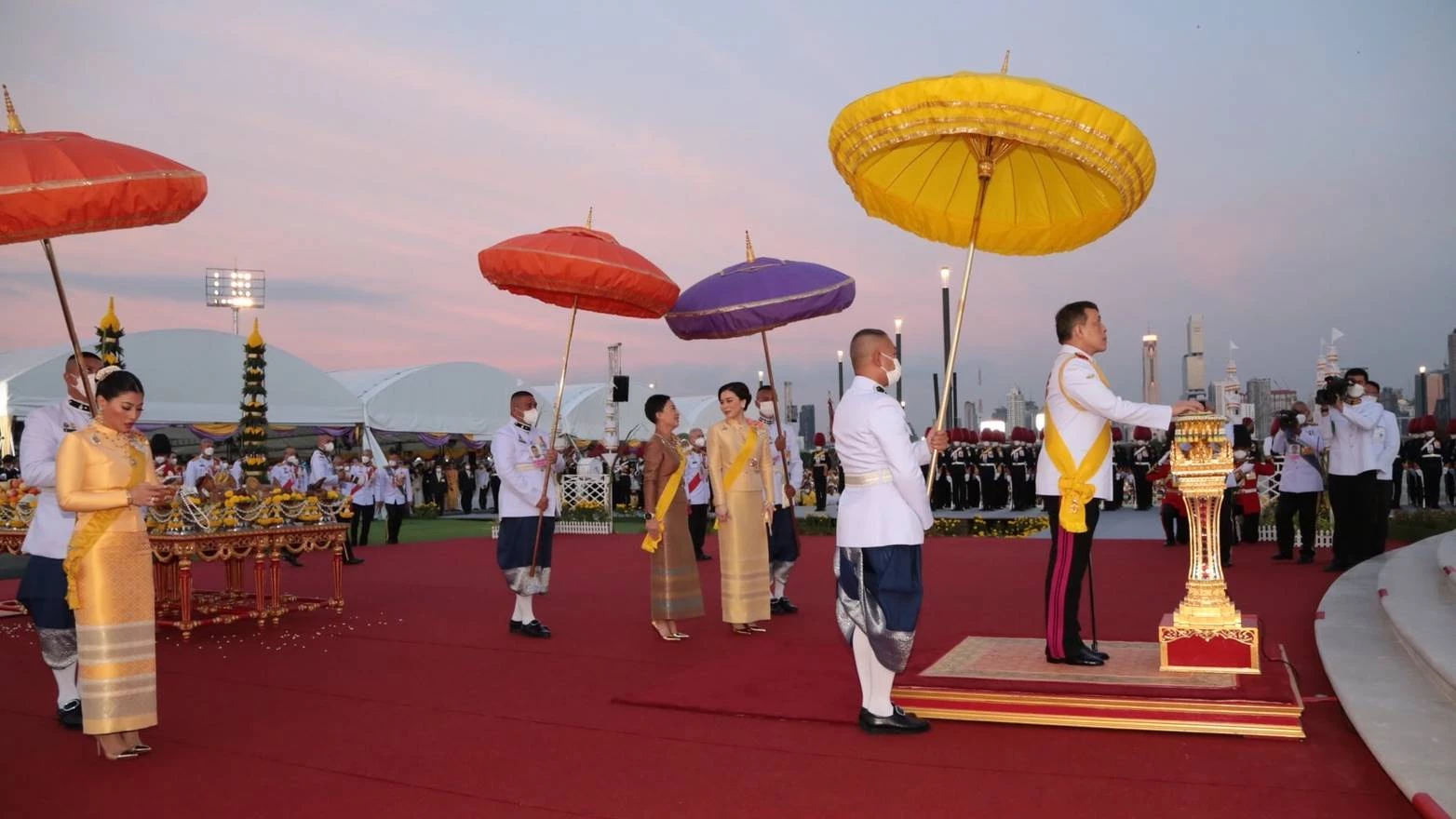 พระบาทสมเด็จพระเจ้าอยู่หัว ทรงวางพุ่มดอกไม้ ทรงจุดธูปเทียนเครื่องทองน้อยถวายสักการะ ทรงกราบ สมเด็จพระนางเจ้าฯ พระบรมราชินี ทรงวางพุ่มดอกไม้ของสมเด็จพระนางเจ้าสิริกิติ์ พระบรมราชินีนาถ พระบรมราชชนนีพันปีหลวง และทรงวางพุ่มดอกไม้ส่วนพระองค์ ทรงจุดธูปเทียนเครื่องทองน้อยถวายราชสักการะ ทรงกราบ