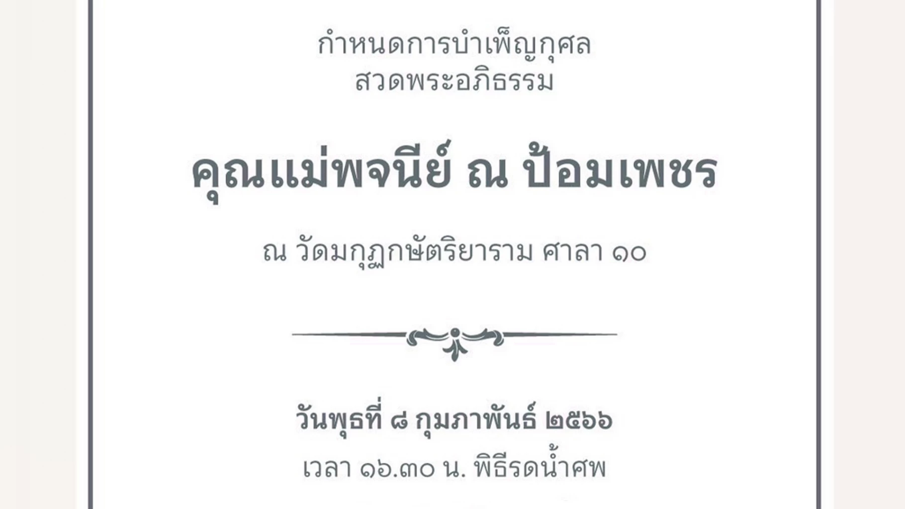 กำหนดการบำเพ็ญกุศล สวดอภิธรรม คุณแม่พจนีย์ ณ ป้อมเพชร มารดาคุณหญิงพจมาน อดีตภรรยาทักษิณ ชินวัตร อดีตนายกรัฐมนตรี