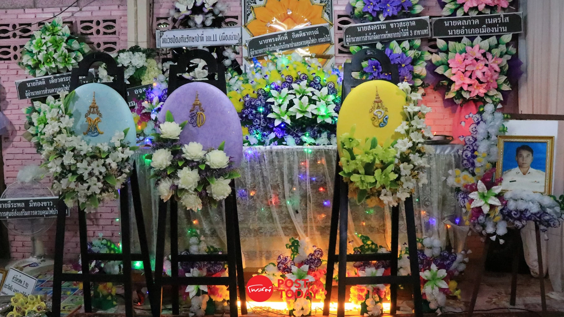 ในหลวง พระราชินี โปรดเกล้าฯ พระราชทานพวงมาลาวางหน้าหีบศพ ศรีวรรณ มิระยศ อดีตสมาชิกอบต.บ่อสวก เสียชีวิตระหว่างปฎิบัติหน้าที่อาสาดับไฟป่าช่วยเหลือประชาชนในพื้นที่