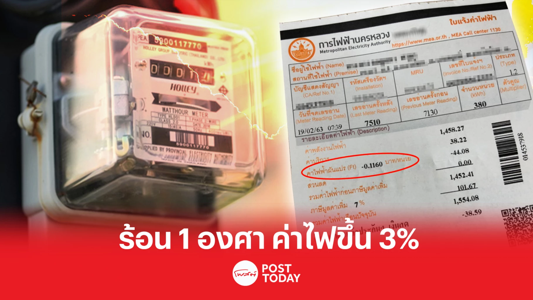 การไฟฟ้านครหลวง เผย อากาศร้อนขึ้นเพียง 1 องศา ทำค่าไฟฟ้าพุ่ง 3% เป็นเหตุให้แม้จะใช้ไฟฟ้าเท่าเดิม แต่ค่าไฟฟ้ากลับเพิ่มขึ้น