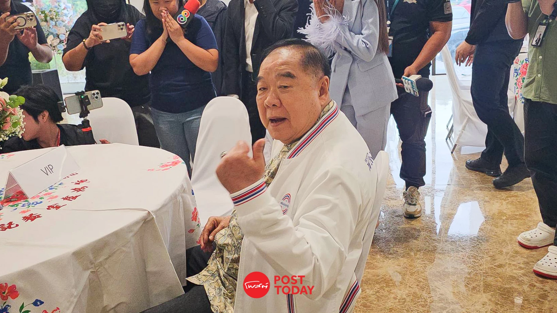 ผู้สื่อข่าวพยายามถามว่า งานเลี้ยง ส.ส.พรรคพลังประชารัฐในวันเดียวกัน เป็นการฉลอง ส.ส.ใหม่ หรือฉลองตำแหน่งนายกรัฐมนตรี โดย พล.อ.ประวิตร กล่าวว่า “ฉลองอะไรที่ไหน เลี้ยงภายในเท่านั้นแหละ”