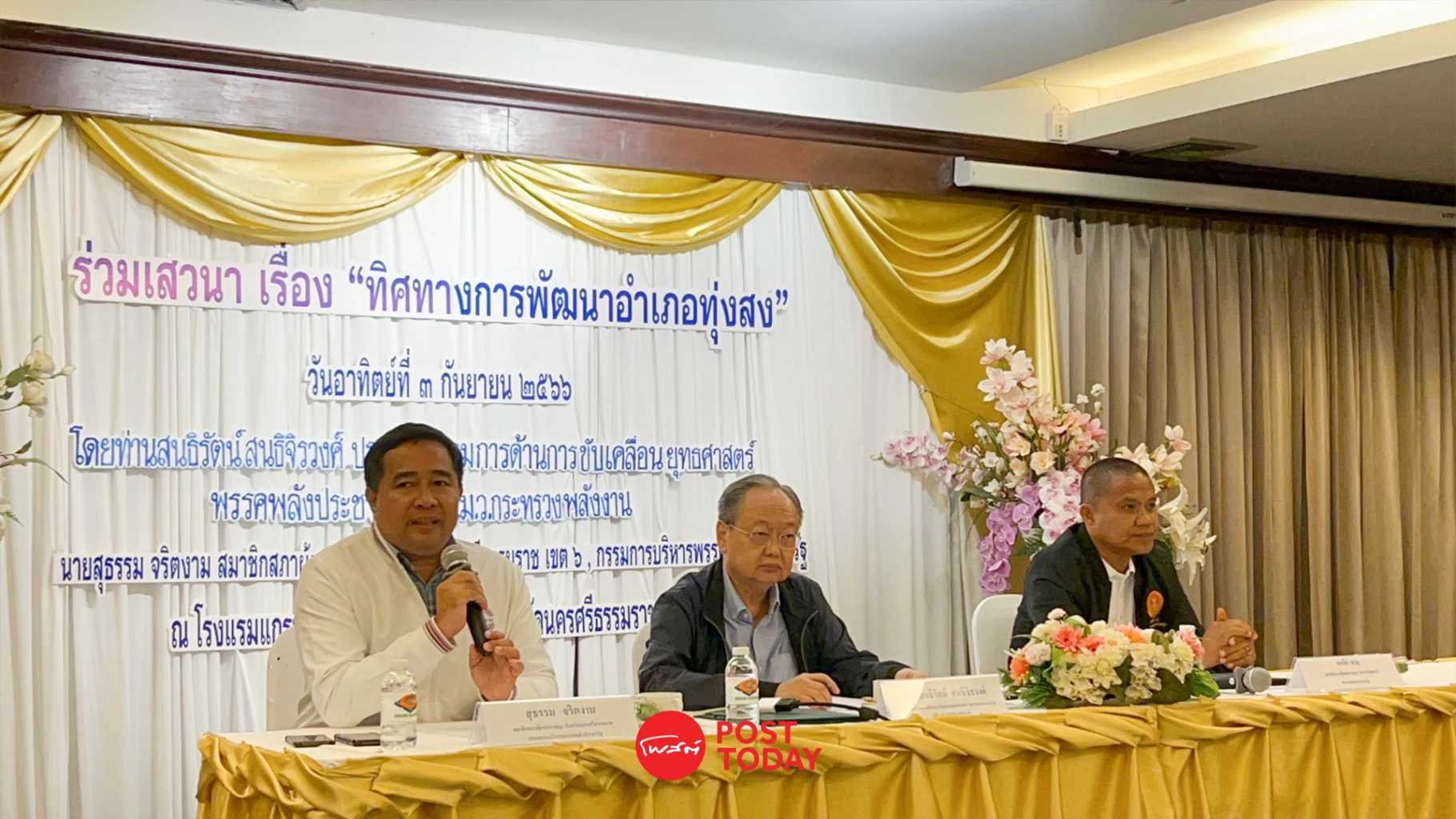 นายสนธิรัตน์ และนายสุธรรม ได้เปิดเวทีถก “ทิศทางการพัฒนาอำเภอทุ่งสง” ซึ่งมีผู้นำชุมชน 13 ตำบล ในอำเภอทุ่งสง เข้าร่วมกว่า 100 คน นายสนธิรัตน์ กล่าวว่า การลงพื้นที่จังหวัดนครศรีธรรมราชครั้งนี้ ตนตั้งใจมาช่วย สส.สุธรรม จริตงาม ในการลงพื้นที่พบปะประชาชน เพื่อรวบรวมปัญหาและข้อเสนอแนะจากพี่น้องประชาชนในการพัฒนาขับเคลื่อนพื้นที่อำเภอทุ่งสงนำไปสู่การพัฒนาอย่างยั่งยืน