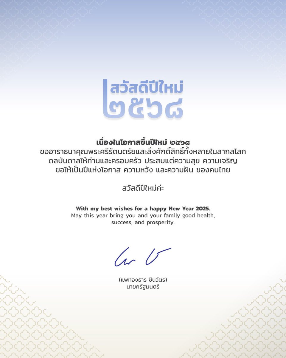 “ในโอกาสปีใหม่นี้ ดิฉันขอให้คนไทยทุกคนได้ใช้เวลาร่วมกับ ครอบครัว เพื่อน และคนที่ท่านรักอย่างมีความสุข เติมพลังกายพลังใจให้พร้อม เตรียมรับโอกาสดี ๆ จากรัฐบาลตลอดปี 2568 และขอให้พี่น้องประชาชนชาวไทยทุกคน ประสบแต่ความสุข ปราศจากอุปสรรคและภัยอันตรายทั้งปวง และประสบความสำเร็จในสิ่งที่มุ่งหวังไว้ทุกประการโดยทั่วกัน สวัสดีปีใหม่ค่ะ” นายกรัฐมนตรี กล่าวอวยพร