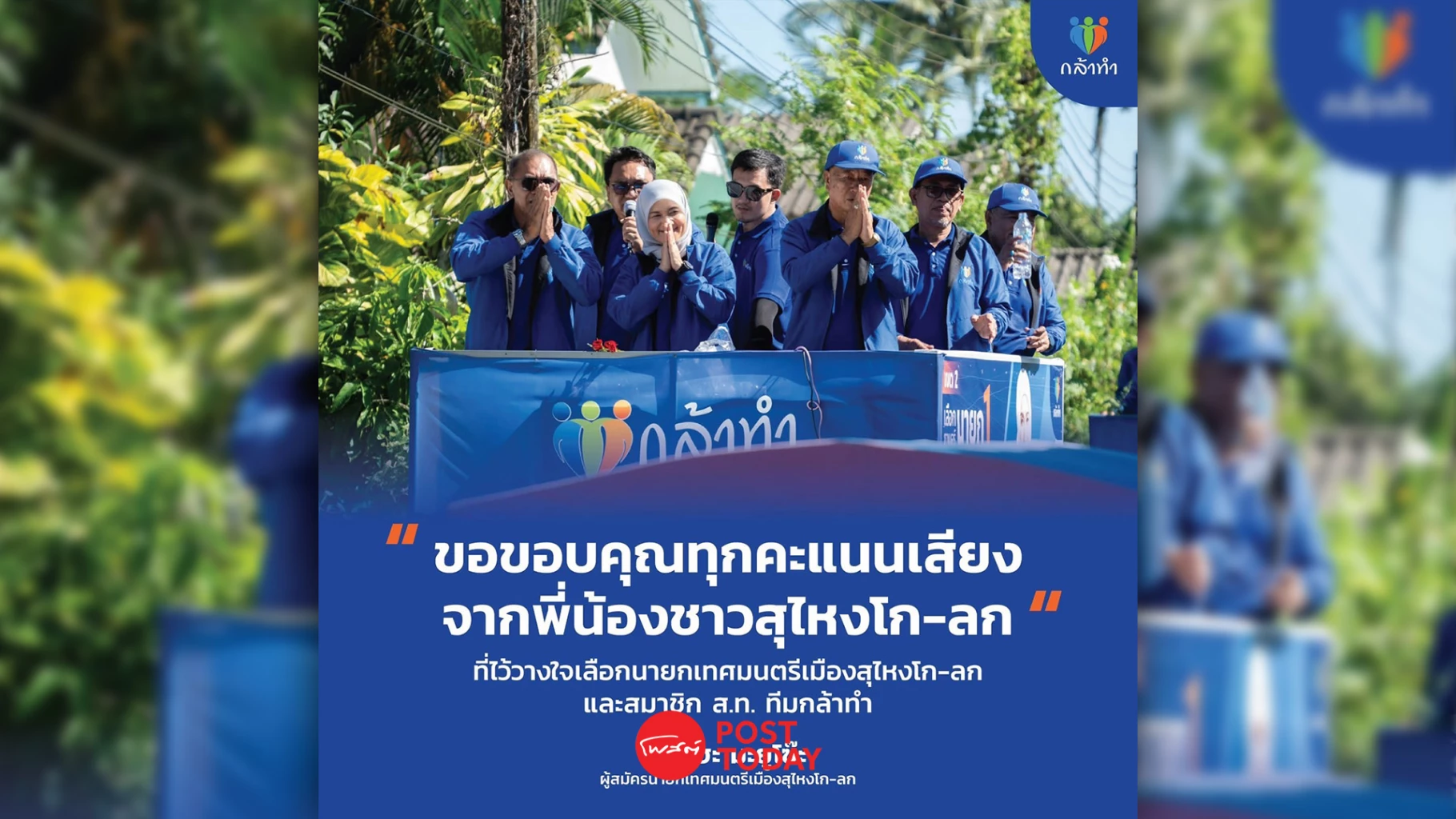 นางสาลีฮะ มะยูโซ๊ะ ผู้สมัครนายกเทศมนตรีเมืองสุไหงโก-ลก และสมาชิก ส.ท. ทีมกล้าทำ ขึ้นรถแห่ขอบคุณประชาชนในพื้นที่หลังทราบผลการลงคะแนนเลือกตั้งอย่างไม่เป็นทางการ ที่ไว้วางใจเลือกนายกเทศมนตรีเมืองสุไหงโก-ลก