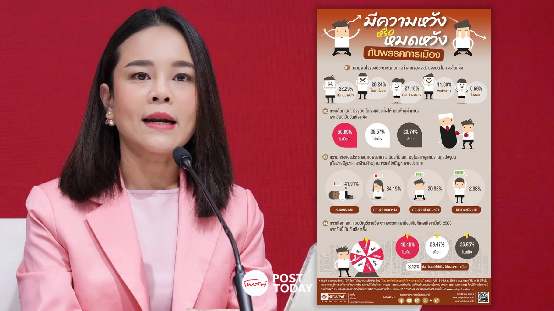 น.ส. ขัตติยา สวัสดิผล สมาชิกสภาผู้แทนราษฎรแบบบัญชีรายชื่อ และรองโฆษกพรรคเพื่อไทย เปิดเผยถึงกรณีผลสำรวจจากนิด้าโพล หัวข้อ"มีความหวัง หรือ หมดหวังจากพรรคการเมือง" โดยระบุว่า