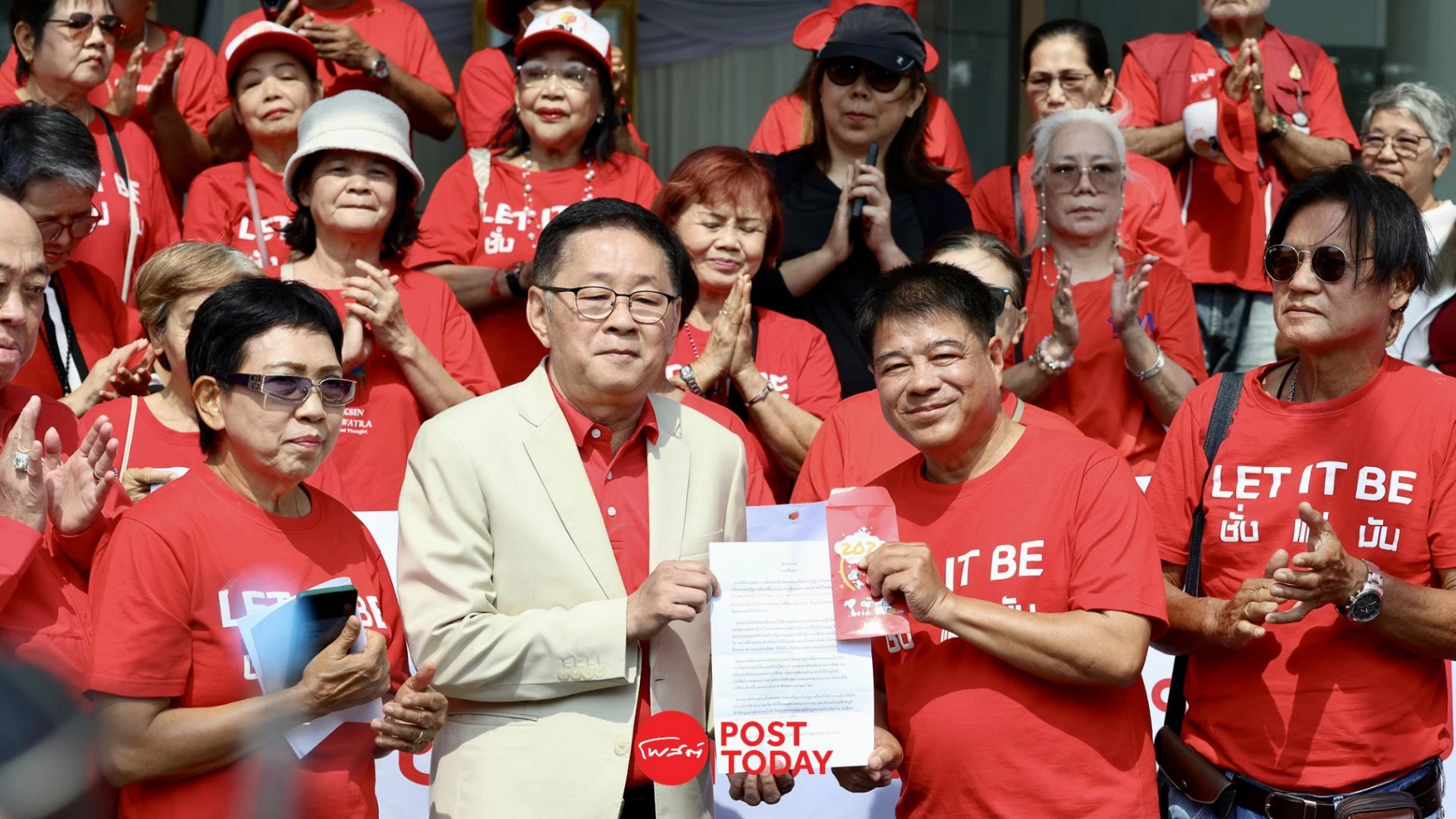 กลุ่มคนเสื้อแดงบุกพรรคเพื่อไทย หนุนร่วมรัฐบาล พร้อมยื่น 3 ข้อเสนอ จี้ลงนามสัตยาบันแก้รัฐธรรมนูญและเร่งผลักดันนโยบายเศรษฐกิจ
