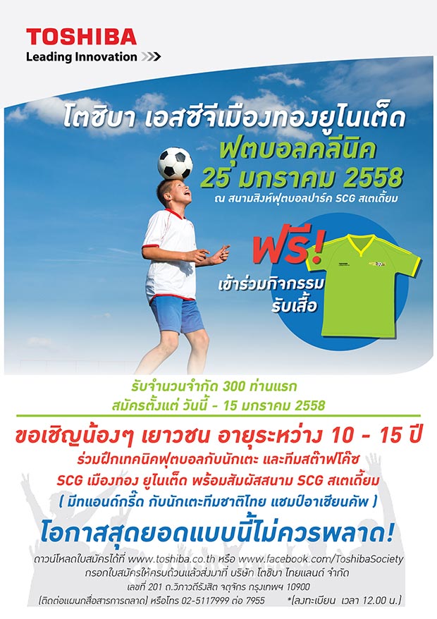 บริษัท โตชิบา ไทยแลนด์ จำกัด ร่วมกับ สโมสร เอสซีจี เมืองทอง ยูไนเต็ด ขอเป็นส่วนหนึ่งที่ร่วมส่งเสริมเด็กๆ ผู้มีใจรักกีฬา จัดกิจกรรม Football Clinic เปิดรับสมัครเยาวชนอายุตั้งแต่ 10-15 ปี จำนวน 300 คน ร่วมพัฒนาทักษะการเล่นฟุตบอลโดยโค้ชและนักเตะมืออาชีพจากสโมสร เอสซีจี เมืองทอง ยูไนเต็ด โดยไม่เสียค่าใช้จ่าย ในวันอาทิตย์ที่ 25 มกราคม 2558 เวลา 12.00 -16.00 น. ณ สนามสิงห์ฟุตบอลปาร์ค เอสซีจี สเตเดี้ยม (สนามหญ้าเทียม) เมืองทองธานี