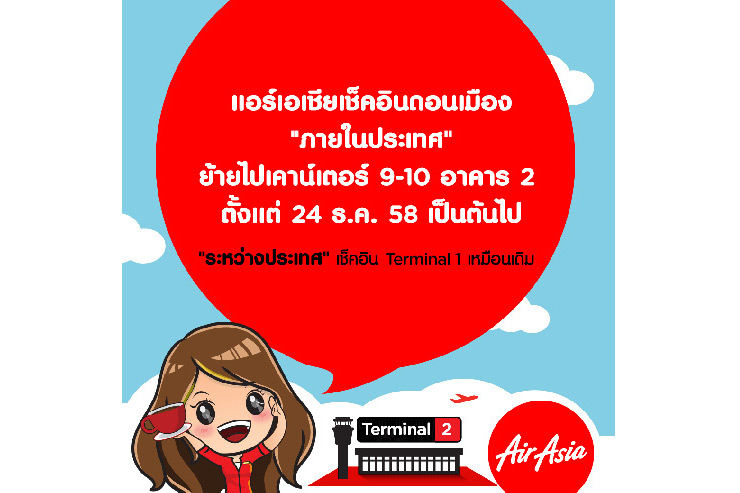 แอร์เอเชียย้ายเคาน์เตอร์เช็คอิน เส้นทางบินในประเทศ ไปที่อาคาร 2 สนามบินดอนเมือง