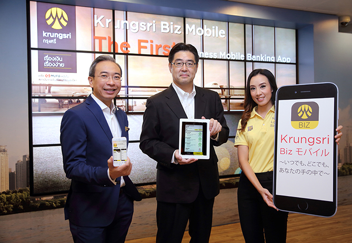 กรุงเทพฯ (28 มีนาคม 2559) – นายมาซาอากิ ซูซูกิ (กลาง) ประธานกลุ่มธุรกิจธนกิจพาณิชย์เกี่ยวกับญี่ปุ่น และ นายฐากร ปิยะพันธ์ (ซ้าย) ประธานคณะเจ้าหน้าที่ด้านกรุงศรีคอนซูมเมอร์และผู้บริหารสายงานดิจิตัล แบงกิ้ง และนวัตกรรม ธนาคารกรุงศรีอยุธยา จำกัด (มหาชน) เปิดตัว “Krungsri Biz Mobile” ครั้งแรกในประเทศไทยกับแอพฯ เพื่อธุรกิจ ให้ผู้บริหารไม่พลาดทุกความเคลื่อนไหวและการตัดสินใจในช่วงเวลาสำคัญ สามารถอนุมัติและตรวจสอบธุรกรรมทางการเงินทั้งจ่ายเงินเดือน จ่ายเช็ค โอนเงิน ได้อย่างสะดวกผ่านแอพฯ ด้วยระบบความปลอดภัยสูงสุด พร้อมระบบแจ้งเตือนแบบ real-time รองรับทั้งภาษาไทย อังกฤษ และญี่ปุ่น สามารถดาวน์โหลด “Krungsri Biz Mobile” ได้แล้ววันนี้ที่ App Store สอบถามข้อมูลเพิ่มเติมได้ที่ &<2288; www.krungsri.com หรือ 0 2626 2626