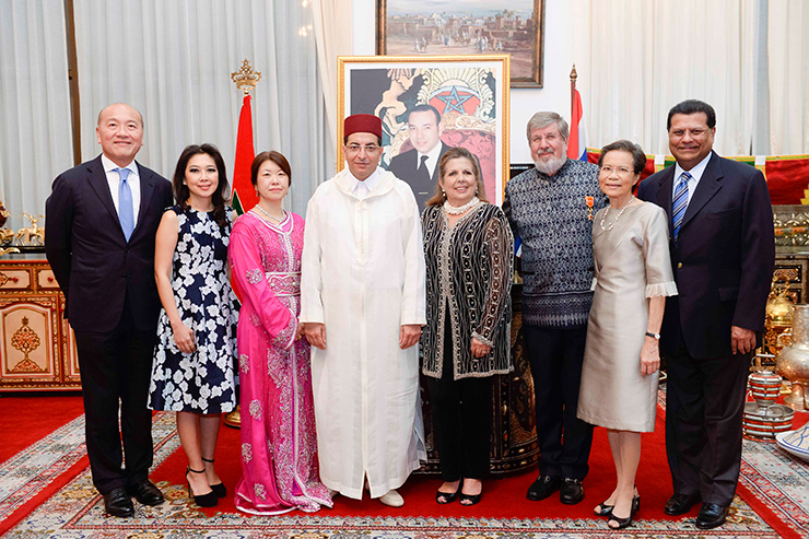 เมื่อเร็วๆนี้ ฯพณฯ อับเดลอิลาห์ เอล ฮุสนี่(ที่ 4 จากซ้าย) เอกอัครราชฑูตโมร็อกโกประจำประเทศไทย ได้เป็นประธานในพิธีมอบเครื่องราชอิสริยาภรณ์ ให้แก่ มร. วิลเลี่ยม เอ็ลล์วู้ด ไฮเน็ค (ที่ 3 จากขวา) ประธานกรรมการและประธานเจ้าหน้าที่บริหาร บ. ไมเนอร์ อินเตอร์เนชั่นแนล จำกัด(มหาชน) พร้อมด้วยคู่สมรส ณ ทำเนียบเอกอัครราชทูตโมร็อกโกประจำประเทศไทย
