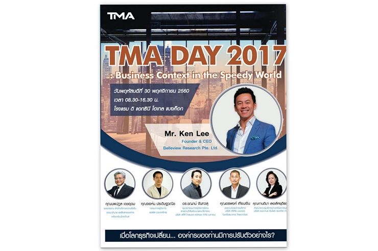สมาคมการจัดการธุรกิจแห่งประเทศไทย (TMA) เตรียมจัดเวทีสัมมนาประจำปี "TMA DAY 2017 "ภายใต้เรื่อง Business Context in the Speedy World ตอบโจทย์การบริหารจัดการธุรกิจที่ครอบคลุม สำหรับผู้นำที่เผชิญความเปลี่ยนแปลงอยู่ตลอดเวลา เพื่อก้าวให้ทันกับทุกกระแส ใครรู้ก่อน ลงมือก่อน เพื่อสร้างความโดดเด่นเชิงศักยภาพขององค์กร โดยจะจัดขึ้นในวันพฤหัสบดีที่ 30 พ.ย.2560 ที่ห้องคริสตัล ฮอลล์ ชั้น 3 โรงแรม ดิ แอทธินี โฮเทล แบงค็อก