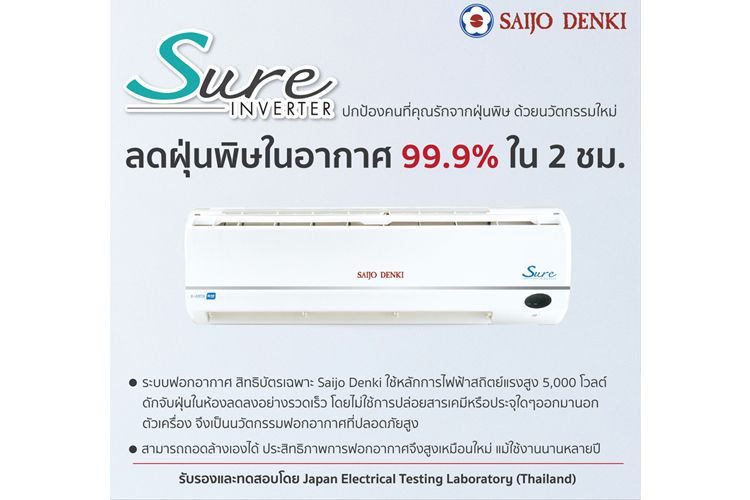 คนส่วนใหญ่อาจคิดว่า การติดแอร์หรือเครื่องปรับอากาศไว้ในบ้าน ก็เพียงพอแล้วที่จะช่วยกรองอากาศเสียจากห้องเราได้ แต่ความจริงแล้ว แอร์ตามบ้านหรืออาคารทั่วไป ไม่สามารถกรองฝุ่นพิษเหล่านั้นได้ จึงจำเป็นต้องมีแอร์ฟอกอากาศมาเป็นตัวช่วยกำจัดฝุ่นพิษภายในห้อง เพื่อไม่ให้เกิดผลเสียต่อร่างกายมนุษย์ ด้วยเหตุนี้ทางบริษัท ซัยโจ เด็นกิ อินเตอร์เนชั่นแนล จำกัด จึงได้คิดค้นแอร์ฟอกอากาศรุ่นอินเวอร์เตอร์ชัวร์ (Inverter Sure) ขึ้น ซึ่งเป็นนวัตกรรมเครื่องปรับอากาศยุคใหม่ที่กำจัดฝุ่นได้ถึง 99.9 เปอร์เซ็นต์