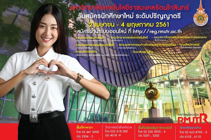 มหาวิทยาลัยเทคโนโลยีราชมงคลรัตนโกสินทร์ ประจำปีการศึกษา 2561 (8 คณะ 1 วิทยาลัย) ตั้งแต่วันที่ 2 เมษายน - 4 พฤษภาคม 2561