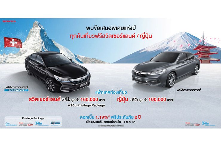 (กรุงเทพฯ – 17 กรกฎาคม 2561) บริษัท ฮอนด้า ออโตโมบิล (ประเทศไทย) จำกัด จัดแคมเปญพิเศษให้แก่ลูกค้าที่จองและซื้อรถยนต์ ฮอนด้า แอคคอร์ด ไฮบริด หรือ แอคคอร์ด ตั้งแต่วันที่ 1 กรกฎาคม – 31 สิงหาคม 2561 และรับรถภายในวันที่ 31 สิงหาคม 2561 โดยลูกค้าฮอนด้า แอคคอร์ด ไฮบริด ทุกคัน รับแพ็กเกจเที่ยวฟรีประเทศสวิตเซอร์แลนด์ 2 ที่นั่ง มูลค่า 160,000 บาท พร้อม Privilege Package มูลค่ากว่า 50,000 บาท และลูกค้า ฮอนด้า แอคคอร์ด ทุกคัน รับแพ็กเกจเที่ยวฟรีประเทศญี่ปุ่น 2 ที่นั่ง มูลค่า 100,000 บาท