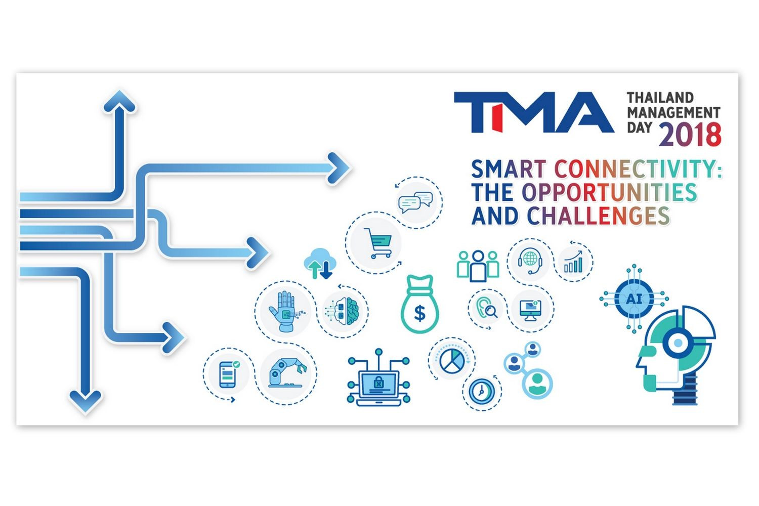 โลกยุคใหม่ถูกเชื่อมโยงด้วยเทคโนโลยีที่ก้าวหน้าและล้ำสมัย ซึ่ง AI หรือปัญญาประดิษฐ์จะเป็นสิ่งขับเคลื่อนเศรษฐกิจทั่วโลก ส่งผลให้สภาวะแวดล้อมการทำงานเปลี่ยนไป ทักษะองค์กรต่างๆ ต้องปรับเปลี่ยนไปตามไปด้วย ขณะเดียวกันข้อมูลกลายเป็นหัวใจสำคัญต่อธุรกิจ องค์กรจะต้องมีเรื่องระบบรักษาความปลอดภัยของข้อมูล จึงเกิดเป็นความท้าทายและโอกาสที่ภาครัฐและเอกชนจะต้องปรับตัว เพื่อก้าวเข้าสู่โลกยุคใหม่ได้อย่างทันท่วงที สมาคมการจัดการธุรกิจแห่งประเทศไทย (TMA) จัดเวทีสัมมนาประจำปี TMA Thailand Management Day 2018 ภายใต้คอนเซปต์ Smart Connectivity: The Opportunities and Challenges วันพฤหัสบดีที่ 29 พฤศจิกายนนี้