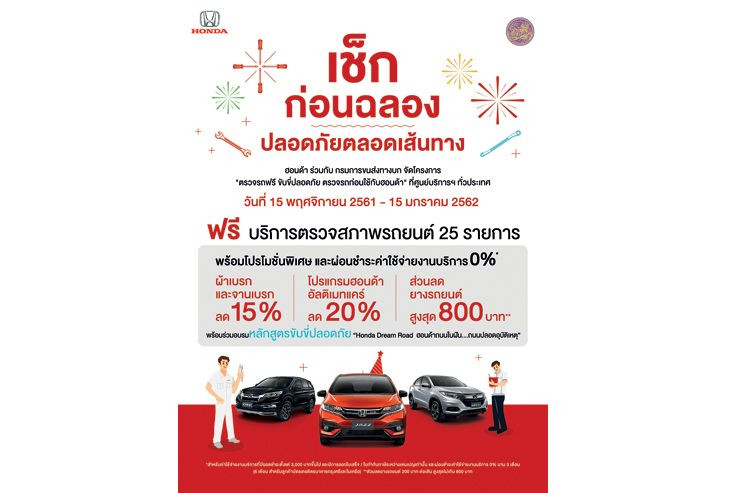 (กรุงเทพฯ – 15 พฤศจิกายน 2561) บริษัท ฮอนด้า ออโตโมบิล (ประเทศไทย) จำกัด ร่วมกับ กรมการขนส่งทางบก จัดแคมเปญบริการต้อนรับปีใหม่ 2562 "ตรวจรถฟรี ขับขี่ปลอดภัย ตรวจรถก่อนใช้กับฮอนด้า" โดยเชิญชวนลูกค้าฮอนด้าเข้ารับบริการตรวจสภาพรถฟรี 25 รายการ พร้อมข้อเสนอแคมเปญผ่อนชำระค่าใช้จ่ายงานบริการ ส่วนลดอะไหล่ และโปรแกรมฮอนด้า อัลติเมท แคร์ โดยลูกค้าสามารถนำรถยนต์เข้ารับบริการตรวจเช็กสภาพ ที่ศูนย์บริการฮอนด้าทั่วประเทศ ตั้งแต่วันนี้ – 15 มกราคม 2562 นอกจากนี้ยังจัดกิจกรรมขับขี่ปลอดภัย ภายใต้โครงการ "Honda Dream Road ฮอนด้าถนนในฝัน...ถนนปลอดอุบัติเหตุ" เพื่อสร้างความมั่นใจและเป็นการเตรียมความพร้อมให้กับผู้ขับขี่ในทุกการเดินทาง