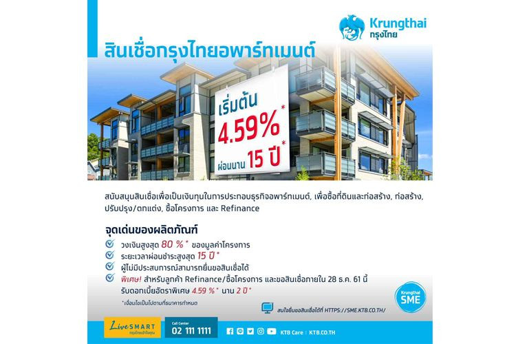 "สินเชื่อกรุงไทยอพาร์ทเมนต์" ให้วงเงินสูงสุด 80% ผ่อนนาน 15 ปี