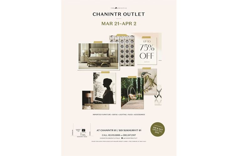 สำหรับผู้ที่กำลังมองหาเฟอร์นิเจอร์ เตรียมตัวพบกับ CHANINTR OUTLET งานที่จะรวบรวมเฟอร์นิเจอร์ระดับไฮเอนด์ในราคาสุดพิเศษ ลดสูงสุดถึง 75 % ไม่ว่าจะเป็นเฟอร์นิเจอร์สำหรับห้องนอน ห้องนั่งเล่น ห้องรับประทานอาหาร และสินค้าตกแต่งบ้าน จากแบรนด์ชั้นนำทั่วโลก มาร่วมสัมผัสถึงดีไซน์ ความหรูหรา เรียบง่าย ที่สะท้อนไลฟ์สไตล์ของผู้ใช้อย่างมีระดับเช่นคุณ