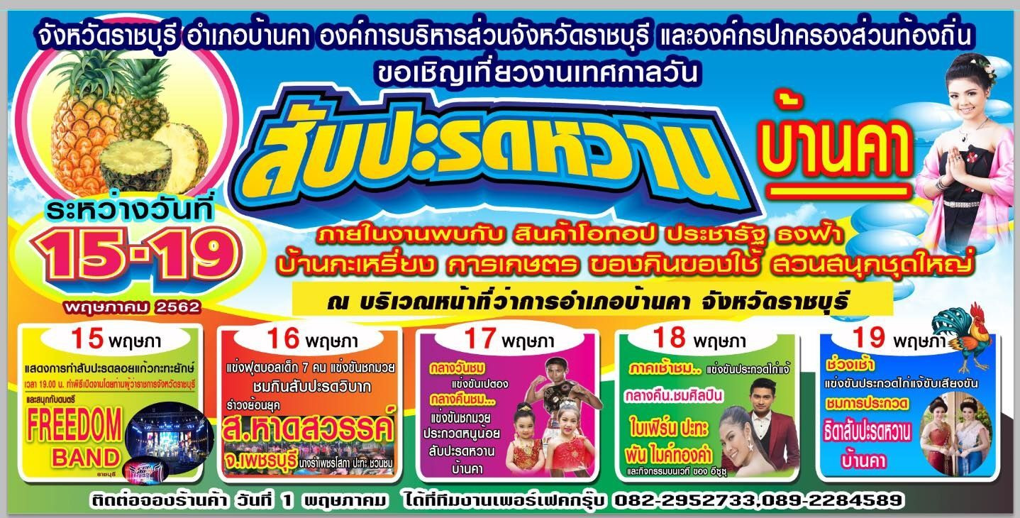นายฑรัท เหลืองสอาด นายอำเภอบ้านคา เปิดเผยว่า อำเภอบ้านคาได้กำหนดจัดงานสับปะรดหวานและของดีอำเภอบ้านคา ประจำปี 2562 ระหว่างวันที่ 15 - 19 พฤษภาคม 2562 ณ บริเวณศูนย์ราชการอำเภอบ้านคา จังหวัดราชบุรี โดยมีวัตถุประสงค์ของการจัดงานเพื่อส่งเสริมความสามัคคีระหว่างภาคราชการ ภาคเอกชน และภาคประชาชน ในการรวมพลังกันจัดกิจกรรมส่งเสริมให้บุคคลทั่วไปได้รู้จักสับปะรดหวานบ้านคาและของดีอำเภอบ้านคา ตลอดจนเพื่อเชิญชวนนักท่องเที่ยวให้เดินทางเข้ามาในพื้นที่และสนับสนุนการเพิ่มรายได้ให้กับกลุ่มเกษตรกรและผู้ประกอบการในพื้นที่ กิจกรรมภายในงานประกอบด้วย การจำหน่ายสับปะรด การประกวดและจำหน่ายผลผลิตทางการเกษตร การจำหน่ายผลิตภัณฑ์ที่มีชื่อเสียงของตำบล การประกวดหนูน้อยสับปะรดหวานบ้านคา การประกวดธิดาสับปะรดหวานบ้านคา แสดงการทำสับปะรดลอยแก้วกะทะยักษ์ การแข่งฟุตบอลเด็ก 7 คน แข่งขันชกมวย การกินสับปะรดวิบาก การแข่งขันเปตอง การแข่งขันชกมวย การแข่งขันประกวดไก่แจ้ สินค้าโอทอป ประชารัฐ ธงฟ้า บ้านกะเหรี่ยง ชมนิทรรศการทางการเกษตร การแสดงศิลปวัฒนธรรมประเพณี การแสดงดนตรีและกิจกรรมอื่น ๆ