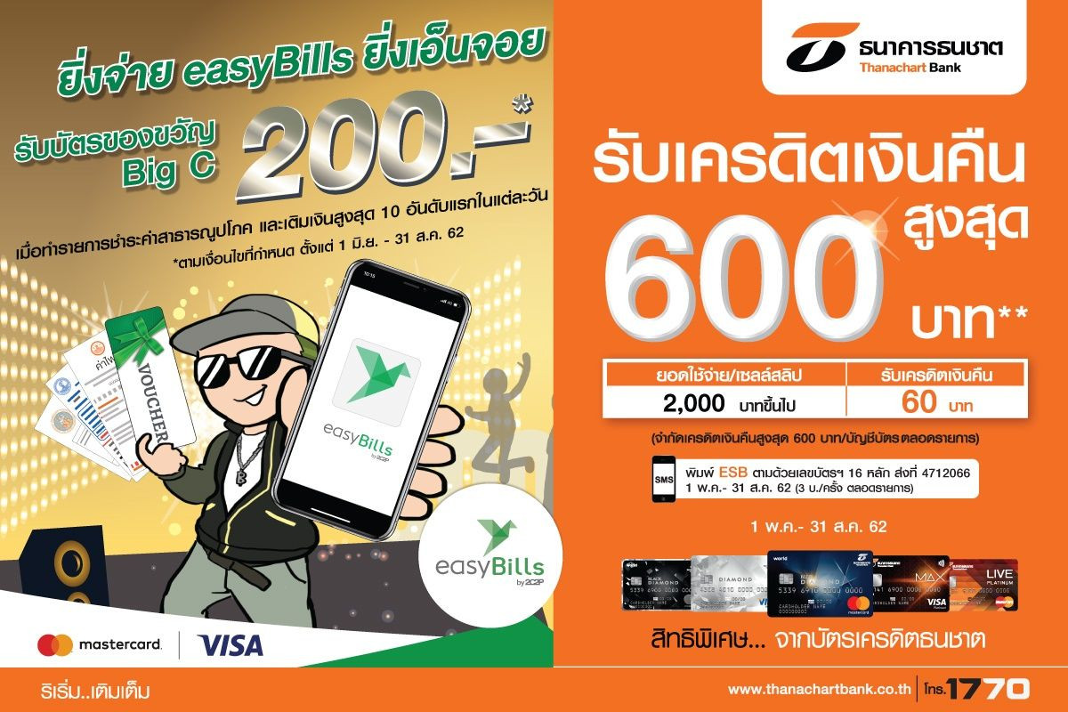 ธนาคารธนชาต จำกัด (มหาชน) ช่วยให้ลูกค้าบัตรเครดิตธนชาต อีซี่และเอ็นจอยยิ่งขึ้น เพียงจ่ายบิลค่าสาธารณูปโภค เติมเงิน และจ่ายค่าใช้จ่ายต่างๆ ที่ไหน เมื่อไหร่ก็ได้ ผ่านแอปพลิเคชั่น easyBills หรือ เว็บไซต์ www.easyBills.in.th รับสิทธิพิเศษ 2 ต่อ ต่อที่ 1 รับบัตรของขวัญ Big C มูลค่า 200 บาท เมื่อชำระค่าสาธารณูปโภค หรือเติมเงินสูงสุด 10 อันดับแรกในแต่ละวัน ต่อที่ 2 รับเครดิตเงินคืนสูงสุด 600 บาท เมื่อใช้จ่าย 2,000 บาท ขึ้นไป/เซลล์สลิป ลงทะเบียนร่วมรายการ พิมพ์ ESB ตามด้วยหมายเลขบัตรเครดิต 16 หลัก ส่งที่ 4712066 สามารถรับสิทธิ์ได้ตั้งแต่วันนี้ – 31 ส.ค. 2562