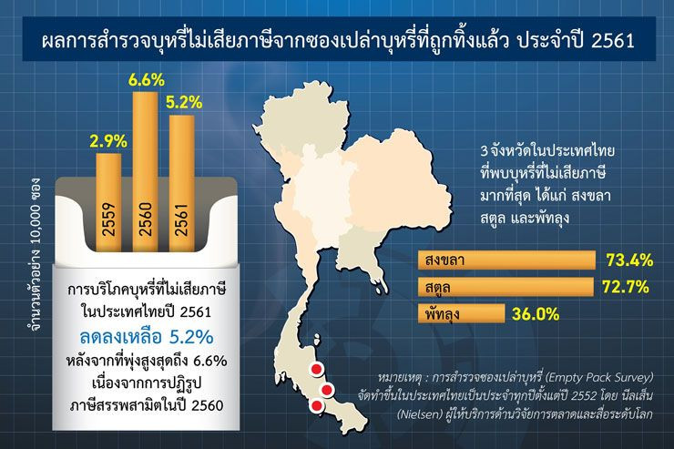 ปัญหาบุหรี่เถื่อนยังคงมีความรุนแรงที่สุดในภาคใต้ โดยจังหวัดสงขลา จังหวัดพัทลุง และจังหวัดสตูล ยังคงติดอันดับ 3 จังหวัดแรกที่มีสัดส่วนบุหรี่ไม่เสียภาษีมากที่สุด