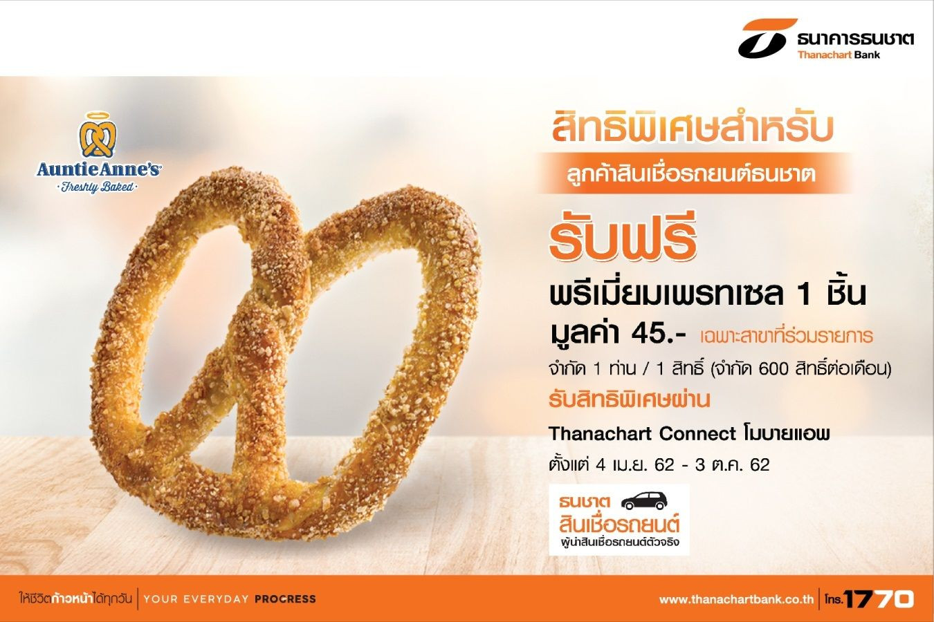 ธนาคารธนชาต จำกัด (มหาชน) มอบสิทธิพิเศษตอบแทนลูกค้าสินเชื่อรถยนต์ธนชาต ทั้งสินเชื่อรถยนต์ใหม่ สินเชื่อรถยนต์ใช้แล้ว และสินเชื่อรถแลกเงิน ให้รับฟรี! พรีเมี่ยมเพรทเซล เพียงกดรับสิทธิ์ผ่าน Thanachart Connect โมบายแอพ ที่ร้านอานตี้ แอนส์ ทุกสาขา (เฉพาะสาขาที่ร่วมรายการ) โดยลูกค้าสามารถกดรับสิทธิ์ได้ตั้งแต่วันนี้ – 3 ต.ค. 2562 (จำกัด 1 ท่าน / 1 สิทธิ์)