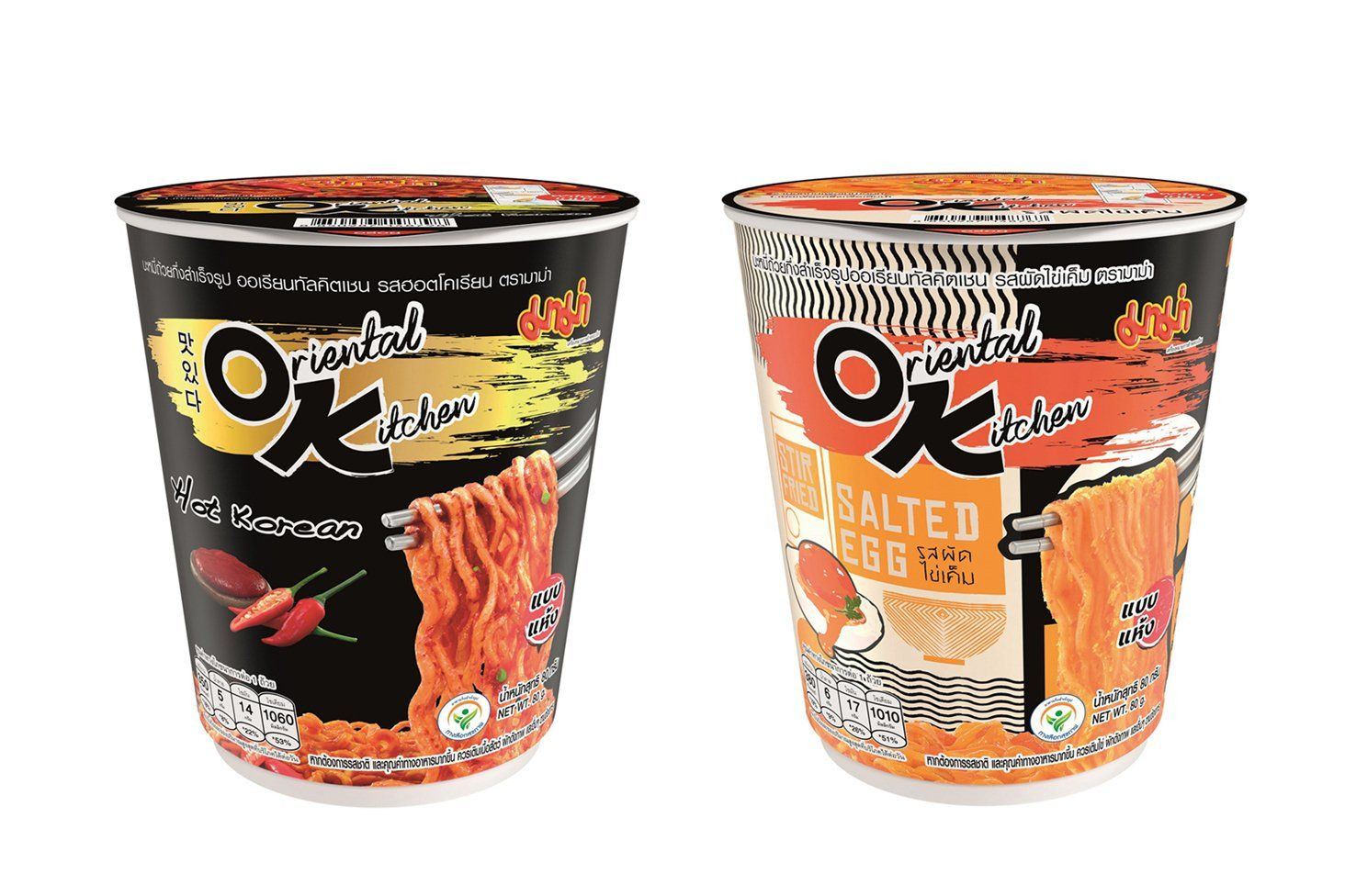 หลังจากที่บะหมี่กึ่งสำเร็จรูปออเรียนทัลคิตเชน หรือ มาม่า OK ครองใจผู้บริโภคด้วยรสชาติที่ถูกปากโดนใจใครหลายคน บริษัท สหพัฒนพิบูล จำกัด (มหาชน) จึงได้ขยายโปรดักส์ไลน์ เพิ่มความสะดวกสบายให้กับผู้บริโภคมากขึ้น โดยเพิ่มทางเลือกจากรูปแบบซองเป็น Cup อีก 2 รสชาติ คือ มาม่า OK คัพ รสฮอตโคเรียน แบบแห้ง ไซส์ใหญ่ 80 กรัม และ มาม่า OK คัพ รสผัดไข่เค็ม แบบแห้ง ไซส์ใหญ่ 80 กรัม ซึ่งใช้นวัตกรรมฝา 2 ชั้น ที่ช่วยให้เทน้ำออกได้สะดวก เอาใจคนชอบบะหมี่กึ่งสำเร็จรูปแบบแห้ง โดยสามารถซื้อสินค้าที่ห้างสรรพสินค้าชั้นนำ ร้านสะดวกซื้อ และร้านค้าทั่วไป หรือสั่งซื้อออนไลน์ได้ทาง www.sahapatdelivery.com ในราคา 20 บาท