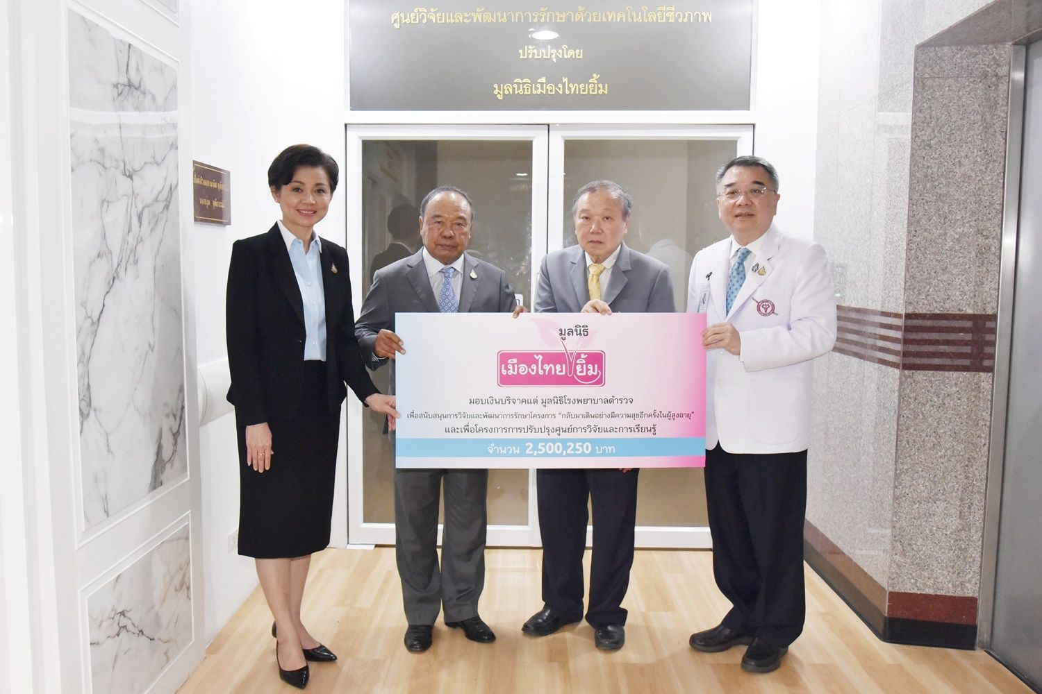 พล.ต.อ. พรศักดิ์ ดุรงควิบูลย์ ประธานมูลนิธิเมืองไทยยิ้ม (ที่ 2 จากซ้าย) และร้อยเอกหญิง ชญาดา หนีพาล (ที่ 1จากซ้าย) กรรมการมูลนิธิเมืองไทยยิ้ม ร่วมมอบเงินบริจาค จำนวน 2,500,250 บาท ให้แก่มูลนิธิโรงพยาบาลตำรวจ ในพระบรมราชินูปถัมภ์ เพื่อสนับสนุนการวิจัยและพัฒนาการรักษาโครงการ “กลับมาเดินอย่างมีความสุขอีกครั้งในผู้สูงอายุ” และเพื่อโครงการการปรับปรุงศูนย์การวิจัยและการเรียนรู้ โดยได้รับเกียรติจาก พล.ต.ต ทรงชัย สิมะโรจน์ เหรัญญิกมูลนิธิโรงพยาบาลตำรวจฯ (ที่ 3 จากซ้าย) และพล.ต.ต.ธนา ธุระเจน รองนายแพทย์ใหญ่โรงพยาบาลตำรวจ (ที่ 4 จากซ้าย) เป็นผู้รับมอบ ณ อาคารมงคลกาญจนาภิเษก ชั้น 10 โรงพยาบาลตำรวจฯ