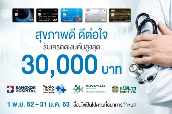 บัตรเครดิต TMB ร่วมกับโรงพยาบาลในเครือ บริษัท กรุงเทพดุสิตเวชการ จำกัด (มหาชน) มอบโปรโมชั่นพิเศษรับเครดิตเงินคืนสูงสุด 30,000 บาท เมื่อมียอดใช้จ่ายผ่านบัตรเครดิตตามกำหนดที่โรงพยาบาลในเครือที่ร่วมรายการ ได้แก่ โรงพยาบาลกรุงเทพ ทุกสาขา โรงพยาบาลเปาโล ทุกสาขา โรงพยาบาลสมิติเวช ทุกสาขา และโรงพยาบาลพญาไท ทุกสาขา ตั้งแต่วันที่ 1 พ.ย. 62 – 31 ม.ค. 63 ยอดใช้จ่าย 10,000 – 29,999 บาท/เซลล์สลิป รับเครดิตเงินคืน 200 บาท ยอดใช้จ่าย 30,000 – 49,999 บาท/เซลล์สลิป รับเครดิตเงินคืน 650 บาท ยอดใช้จ่าย 50,000 – 99,999 บาท/เซลล์สลิป รับเครดิตเงินคืน 1,200 บาท ยอดใช้จ่าย 100,000 บาทขึ้นไป/เซลล์สลิป รับเครดิตเงินคืน 2,500 บาท จำกัดรับเครดิตเงินคืนสูงสุด 30,000 บาท / บัตร ตลอดรายการ ลงทะเบียน SMS ก่อนทำรายการเพื่อรับสิทธิ์ พิมพ์ TMBBH ตามด้วยหมายเลขบัตรเครดิต TMB 12 หลักสุดท้าย ส่งมาที่ 4806026 สอบถามรายละเอียดเพิ่มเติมที่ TMB Contact Center โทร. 1558 และดูรายละเอียดเพิ่มเติม www.tmbbank.com