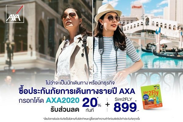 บริษัท แอกซ่าประกันภัย จำกัด (มหาชน) แนะนำโปรโมชั่นประกันภัยการเดินทาง ต้อนรับเทศกาลแห่งการท่องเที่ยวในช่วงปลายปี สำหรับลูกค้าที่ซื้อประกันภัยการเดินทางรายปีแบบแพลทตินัมหรือ เอมเมอรัลด์ พร้อมระบุรหัสโปรโมชั่น “AXA2020” เพื่อรับส่วนลดค่าเบี้ยประกัน 20% และรับซิมโรมมิ่งแบบเติมเงิน AIS SIM2Fly มูลค่า 899 บาท สำหรับใช้งานอินเทอร์เน็ตในทุกทวีปทั่วโลก ลูกค้าสามารถดู