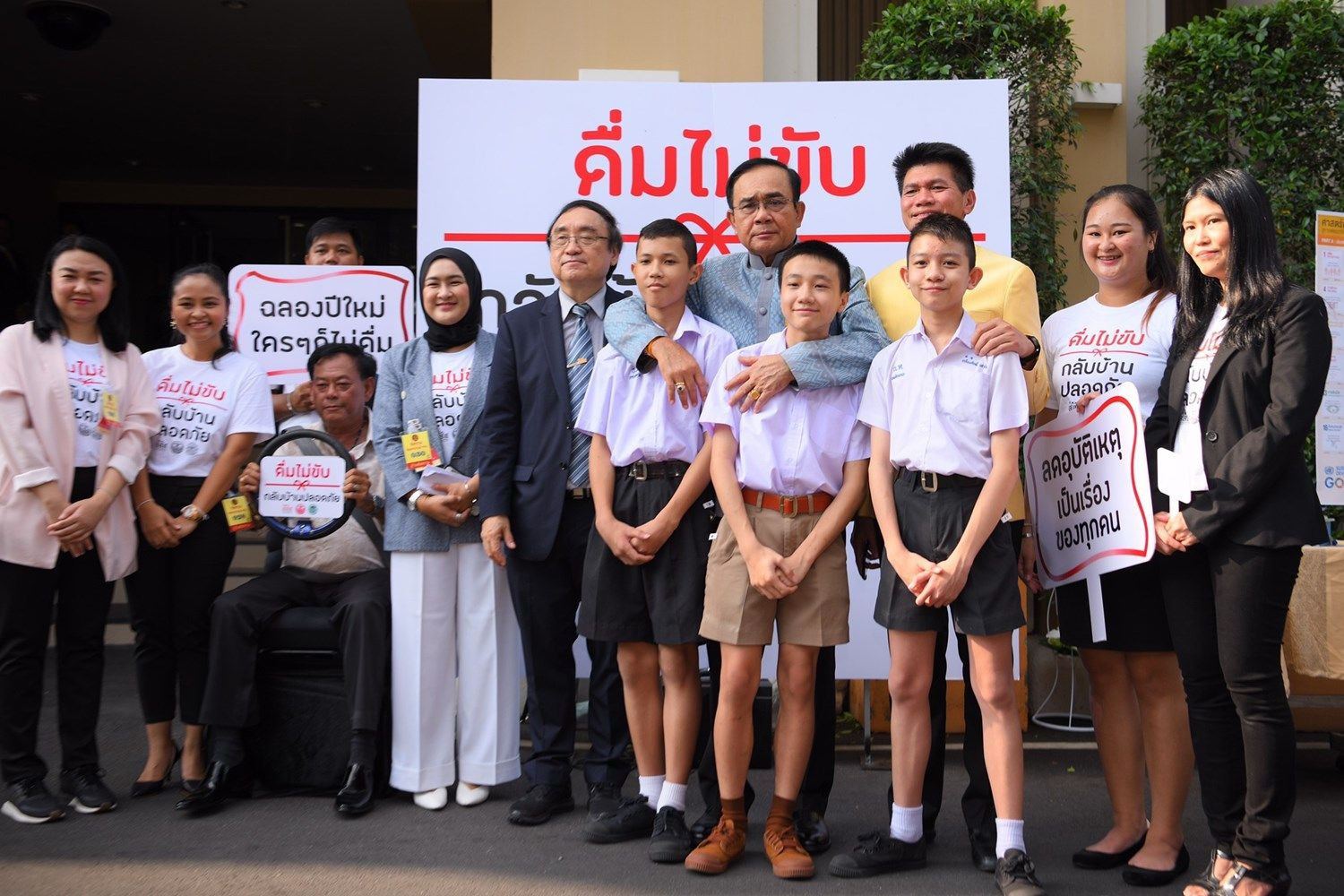 พล.อ.ประยุทธ์ จันทร์โอชา นายกรัฐมนตรีและรมว.กลาโหม และนายสาธิต ปิตุเตชะ รมช.สาธารณสุข ในฐานะรองประธานกรรมการกองทุนสนับสนุนการสร้างเสริมสุขภาพ (สสส.) คนที่ 1 พร้อมด้วย ดร.สุปรีดา อดุลยานนท์ ผู้จัดการกองทุน สสส. และภาคีเครือข่าย อาทิ เครือข่ายเยาวชนป้องกันนักดื่มหน้าใหม่ เครือข่ายเยาวชนลดปัจจัยเสี่ยง ร่วมกันกิจกรรมรณรงค์ “ดื่มไม่ขับ กลับบ้านปลอดภัย” เพื่อสื่อสารเชิญชวนผู้ใช้รถใช้ถนน ใส่ใจกฏจราจร รับผิดชอบเพื่อนร่วมทางด้วยการดื่มไม่ขับ ใช้ความเร็วไม่เกินกฏหมายกำหนด ใส่หมวกกันน็อกทุกครั้ง คาดเข็มขัดทั้งคนขับ-คนนั่ง และง่วงไม่ขับ ณ ทำเนียบรัฐบาล