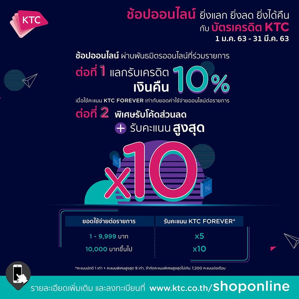 “เพื่อต้อนรับปีใหม่และเทศกาลแห่งความสุขที่กำลังจะมาถึงในช่วงไตรมาสแรกของปี 2563 เคทีซีจึงจัดแพ็คสิทธิพิเศษหลักสุดคุ้ม มอบให้กับสมาชิกนักช้อปออนไลน์ “ยิ่งแลก ยิ่งลด ยิ่งได้คืน กับบัตรเครดิตเคทีซี” ประกอบด้วย ต่อที่ 1 แลกรับเครดิตเงินคืน 10% ของยอดใช้จ่ายออนไลน์จากพันธมิตรที่ร่วมรายการผ่านบัตรเครดิตเคทีซี เมื่อใช้คะแนน KTC FOREVER เท่ากับยอดใช้จ่ายออนไลน์ต่อรายการ ต่อที่ 2 รับโค้ดส่วนลดจากพันธมิตรออนไลน์ที่ร่วมรายการ พร้อมรับคะแนน KTC FOREVER เมื่อช้อปตั้งแต่ 1 บาท - 9,999 บาทต่อรายการ รับคะแนน 5 เท่า (คะแนนปกติ 1 เท่า และคะแนนพิเศษ 4 เท่า) หรือรับคะแนน KTC FOREVER 10 เท่า (คะแนนปกติ 1 เท่า และคะแนนพิเศษ 9 เท่า) เมื่อช้อปตั้งแต่ 10,000 บาทขึ้นไปต่อรายการ ตั้งแต่วันที่ 1 มกราคม 2563 – 31 มีนาคม 2563 โดยสามารถสอบถามรายละเอียดเพิ่มเติมและลงทะเบียนแลกรับสิทธิพิเศษดังกล่าวได้ที่ www.ktc.co.th/shoponline แหล่งรวมโค้ดส่วนลดจากพันธมิตรออนไลน์มากที่สุด สำหรับผู้ที่ต้องการสมัครสมาชิกบัตรเครดิตเคทีซี สามารถคลิกดูรายละเอียดได้ที่ลิงค์ http://bit.ly/2uPcS19 หรือติดต่อศูนย์บริการสมาชิก “เคทีซี ทัช” ทุกสาขาทั่วประเทศ”