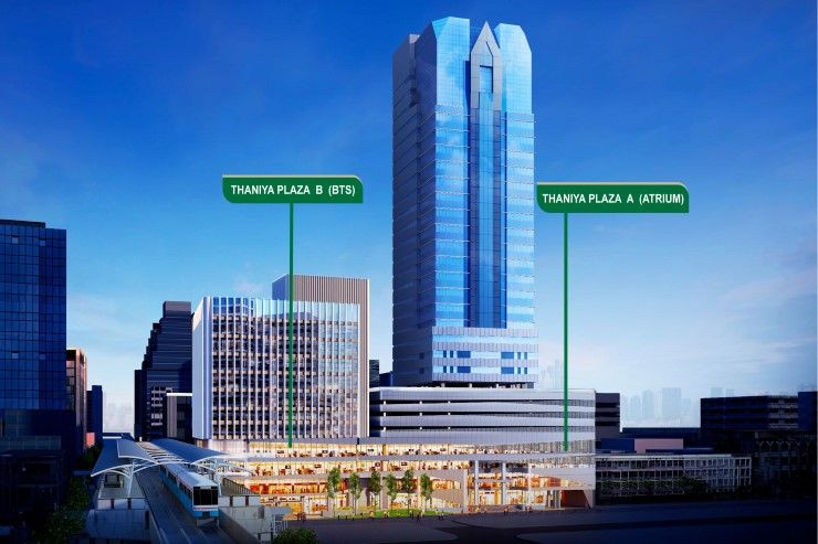 เป็นอาคารสองหลังที่เชื่อมต่อกัน และเชื่อมต่อกับสถานีรถไฟฟ้าบีทีเอส ศาลาแดง และสถานีรถไฟฟ้าใต้ดินสีลม ธนิยะ กรุ๊ป ได้ริเริ่มนำเอาคอนเซ็ปต์ มิกซ์ยูส มาใช้เป็นรายแรกๆ ในธุรกิจอสังหาริมทรัพย์ ด้วยการเพิ่มโซน รีเทล โพเดียม ชั้น 1 - 4 ที่เรียกเคยว่า ตึกหน้า (อาคารธนิยะ บีทีเอส วิง) และตึกใหญ่ (อาคารธนิยะ พลาซา) เพื่อให้เป็นพื้นที่จำหน่ายสินค้าและบริการต่างๆ โดยกว่า 80% เป็นกลุ่มร้านค้าที่จำหน่ายอุปกรณ์กอล์ฟแบบครบวงจร ซึ่งจัดได้ว่าเป็น Golf Center ที่ใหญ่ที่สุดในประเทศไทยและเอเชียตะวันออกเฉียงใต้ เพราะกล่าวได้ว่า กอล์ฟ เป็นกีฬาที่ได้รับความนิยมสูงมาอย่างต่อเนื่อง และอีก 20% เป็นร้านอาหารญี่ปุ่น เพื่อรองรับความต้องการของกลุ่มผู้เช่าชาวญี่ปุ่นและผู้ชื่นชอบอาหารญี่ปุ่นในพื้นที่ใกล้เคียง และร้านจำหน่ายสินค้าประเภทต่างๆ เช่น ร้านขายอุปกรณ์กล้องฟิล์มที่หาได้ยากแล้วในปัจจุบัน