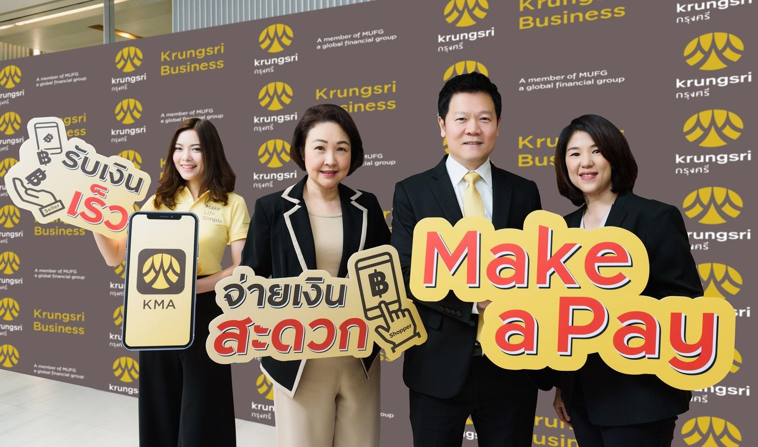 นายสยาม ประสิทธิศิริกุล (ที่ 2 จากขวา) ประธานคณะเจ้าหน้าที่ด้านลูกค้าธุรกิจ SME นางยิ่งลักษณ์ คงคาสัย (ที่ 2 จากซ้าย) ประธานคณะเจ้าหน้าที่ด้านธุรกรรมการเงิน และนางนิลวรรณ จีระบุญ (ขวาสุด) ผู้บริหารสายงานพัฒนาผลิตภัณฑ์ธุรกรรมการเงิน ธนาคารกรุงศรีอยุธยา จำกัด (มหาชน) ร่วมเปิดตัว ‘Make a Pay’ บริการรับชำระเงินค่าสินค้าและบริการผ่านช่องทางออนไลน์สำหรับลูกค้าธุรกิจ SME และร้านค้าออนไลน์ต่างๆ เพื่อเพิ่มความสะดวกปลอดภัยแก่ผู้ซื้อสินค้าหรือใช้บริการในการชำระเงินผ่านแอปพลิเคชันของร้านค้าหรือธุรกิจซึ่งต่อเชื่อมสู่แพลตฟอร์ม Krungsri Mobile Application (KMA) ช่วยให้ร้านค้าสามารถปิดการขายและรับเงินได้เร็วขึ้น นอกจากนี้ Make a Pay ยังช่วยลดค่าใช้จ่ายในการบริหารเงินสดและการดำเนินงานของผู้ประกอบการพร้อมช่วยเพิ่มประสิทธิภาพในการบริหารบัญชีในขณะเดียวกัน