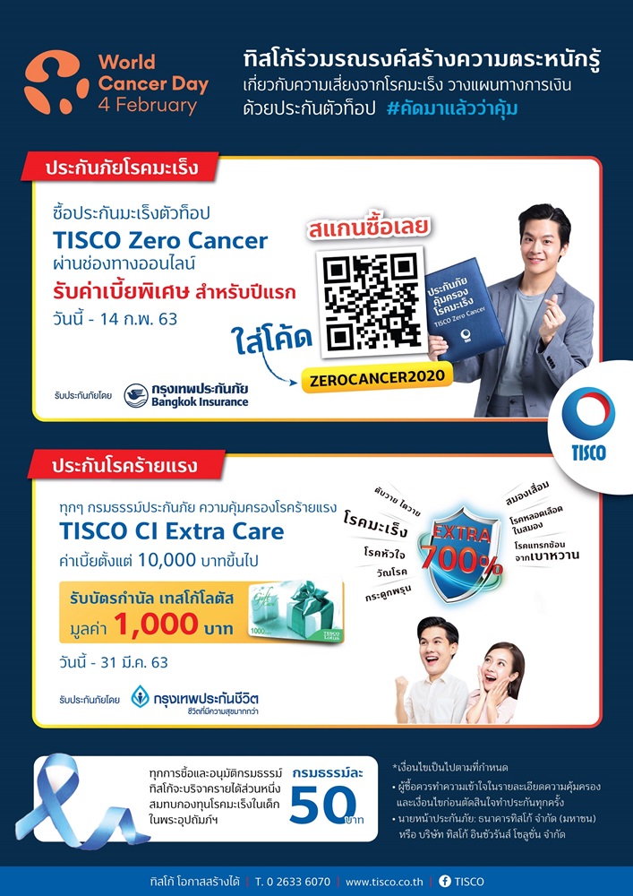 กลุ่มทิสโก้จัดโปรโมชั่นรับ World Cancer Day ซื้อผลิตภัณฑ์ประกันมะเร็งตัวท็อป TISCO Zero Cancer ผ่านช่องทางออนไลน์ที่ www.tiscoinsure.com เพียงกรอกข้อมูลระบุตัวตน และแถลงสุขภาพออนไลน์ หากผ่านการอนุมัติ จะได้รับกรมธรรม์ทางอีเมลและเริ่มคุ้มครองในทันที พร้อมรับค่าเบี้ยประกันภัยราคาพิเศษสำหรับปีแรก ตั้งแต่วันนี้ ถึง 14 ก.พ. 63 หรือ ซื้อประกันคุ้มครองโรคร้ายแรง TISCO CI Extra Care ผ่านสาขาธนาคาร ที่ค่าเบี้ยประกันตั้งแต่ 10,000 บาทขึ้นไป รับบัตรกำนัลเทสโก้โลตัส มูลค่า 1,000 บาท ตั้งแต่วันนี้ถึง 31 มี.ค. 63 และทุกๆ กรมธรรม์ที่ได้รับอนุมัติ ทิสโก้จะบริจาคสมทบทุนกรมธรรม์ละ 50 บาท ให้กองทุนโรคมะเร็งในเด็ก ในพระอุปถัมภ์ฯ เพื่อสนับสนุนงานวิจัยทางการแพทย์เกี่ยวกับการรักษาโรคมะเร็งในเด็ก